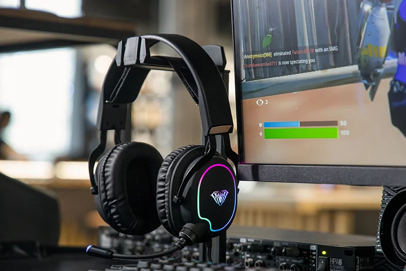 Модель снабжена микрофоном с шумоподавлением на гибкой ножке, который можно отключить с помощью кнопки пульта ДУ на кабеле, на нем также есть колесо громкости наушников. Что касается звучания — лучше всего в AULA F606 проработана середина, особенно верхняя, а по краям частотного спектра наблюдаются спады. Такая настройка хорошо подходит для игры: самые важные звуки — шаги, выстрелы и человеческая речь — слышны четко и чисто, а вот музыка из-за недостатка нижнего баса и верхних частот звучит мутновато и недостаточно энергично.