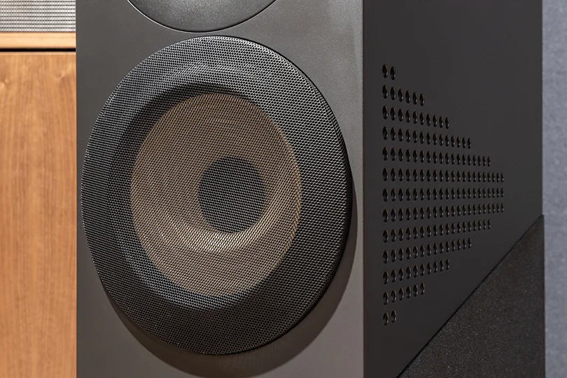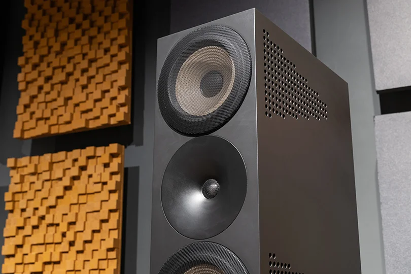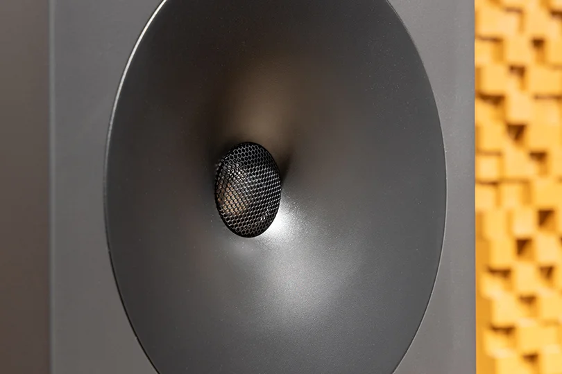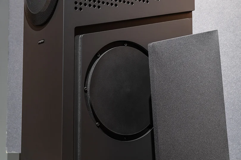 Весь корпус акустики опирается на прочную деревянную плиту, которая предотвращает падение тяжелой колонны. Боковые стенки корпуса имеют две конические площадки с многочисленными отверстиями. Это не только выглядит интересно, но и имеет звуковую функцию, о которой мы расскажем ниже. Диффузоры и волновод твитера устанавливаются в корпус с идеальной точностью. Винтовое соединение практически незаметно благодаря металлической решетке. В этой паре акустики проявляется культура производства Amphion. Заметим, что она неизменно сохраняется от самой бюджетной модели до High End.