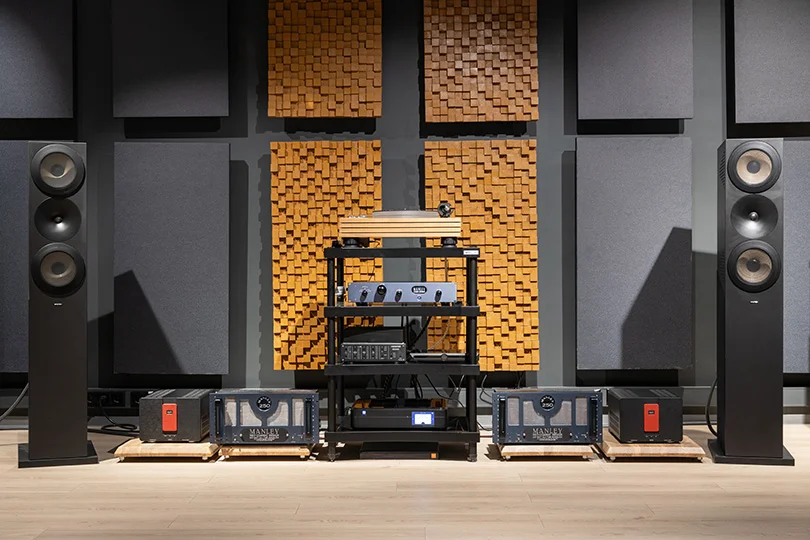 Комната прослушивания устроена как гостиная, чтобы предоставить нашим читателям опыт, а не сухие измерения. Ставим колонки рядом с нашими High End компонентами. За насыщение Krypton3X мощностью отвечают моноблоки SPL Performer M1000 — настоящие линкоры среди усилителей. Число в названии указывает на мощность. В нашей установке акустика расположена достаточно широко. От стен мы оставили где-то по 40 см.