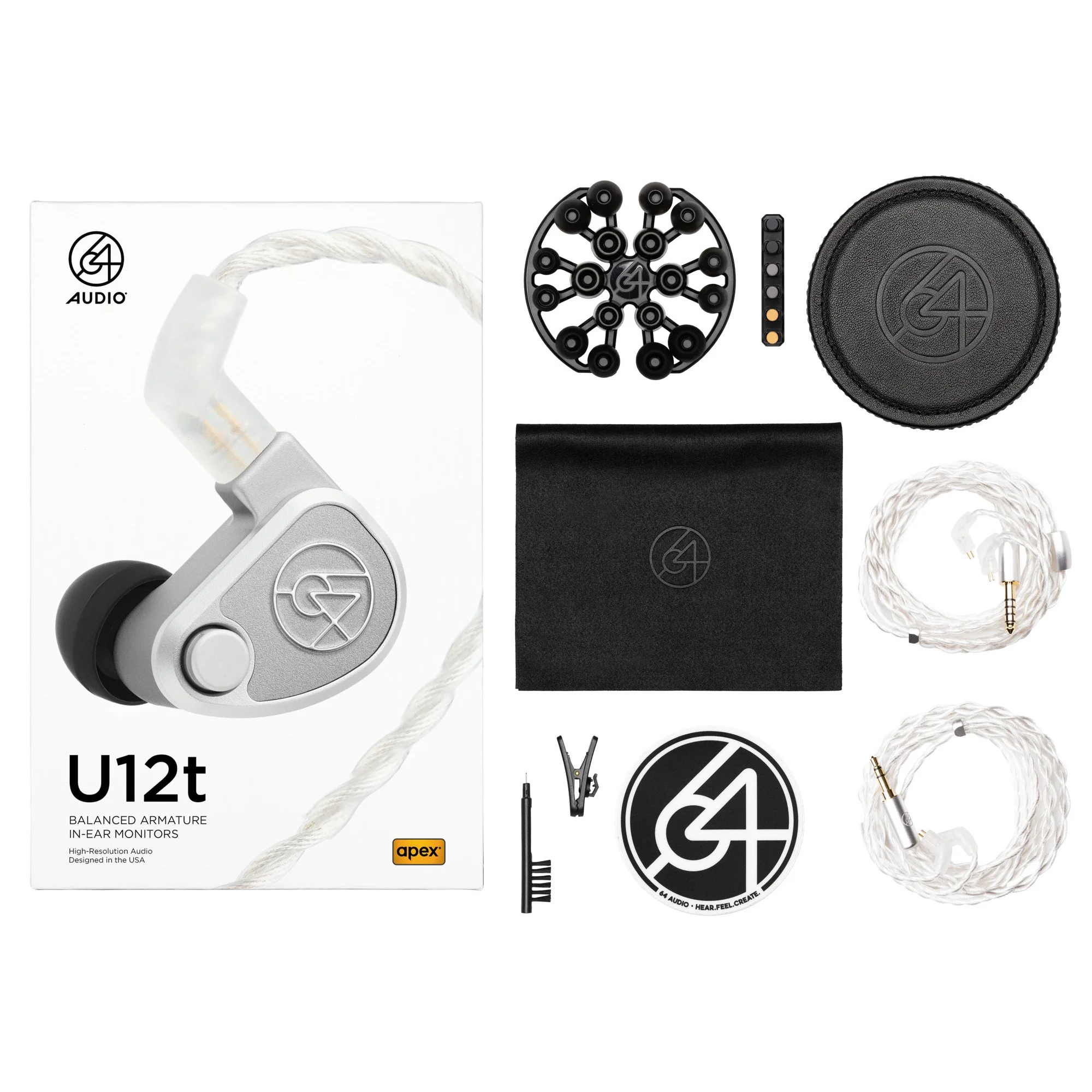 64 Audio U12t - двенадцатидрайверные арматурные наушники. Четыре излучателя отыгрывают низкие частоты, шесть отвечают за середину, один tia-драйвер за средне-высокие и еще один Tia - за высокие частоты. За согласование излучателей отвечает 4-канальный пассивный кроссовер.