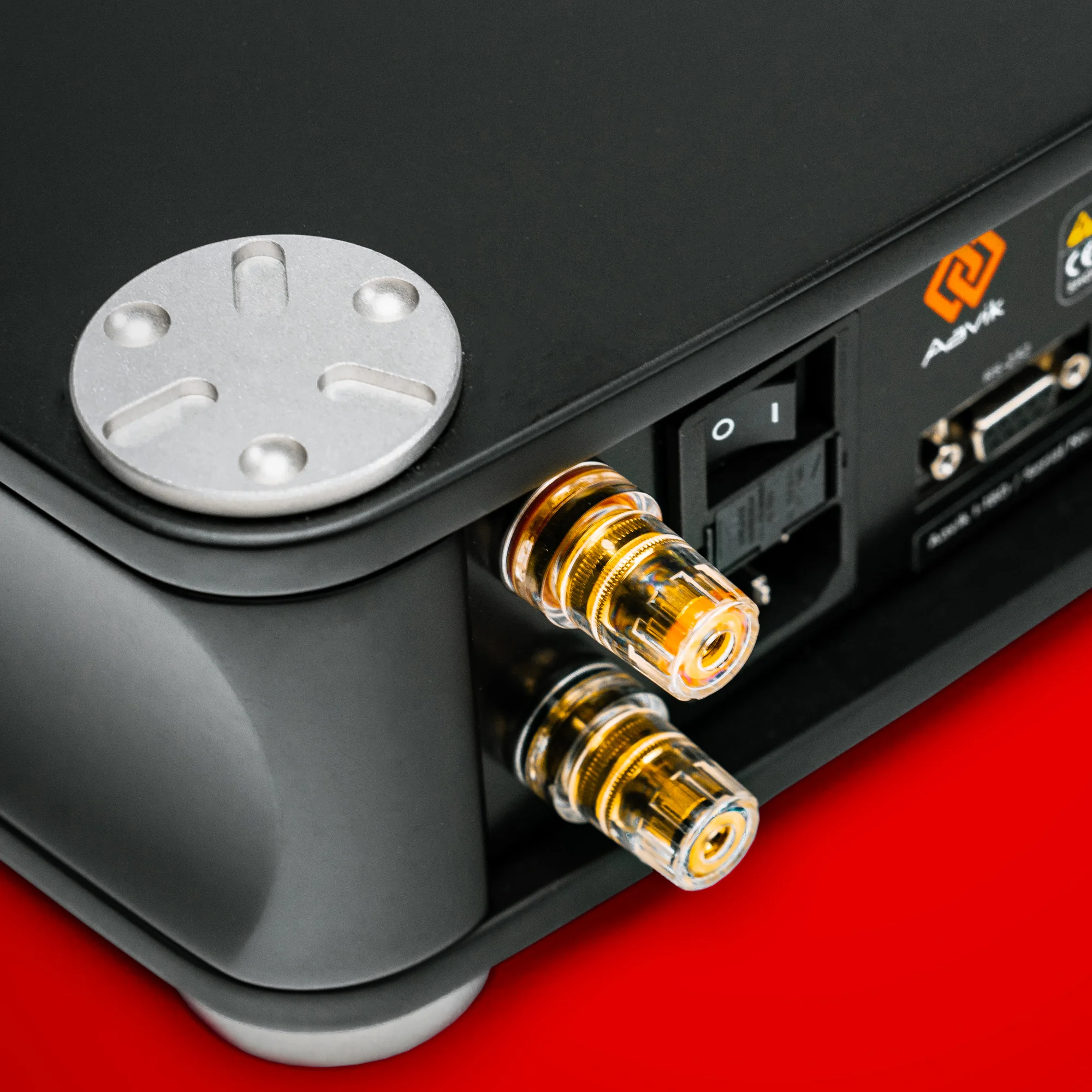 Блок питания обеспечивает гораздо лучшее распределение мощности и огромный динамический запас. В отличие от прямоугольных импульсов, используемых в обычных импульсных источниках питания, резонансные источники питания Aavik имеют конструкцию, в основе которой лежат синусоидальные волны. Когда требуется больше мощности, рабочая частота увеличивается, что, в свою очередь, имеет то преимущество, что плотность мощности также увеличивается. Это обеспечивает более высокую пиковую мощность, когда этого требует музыка.