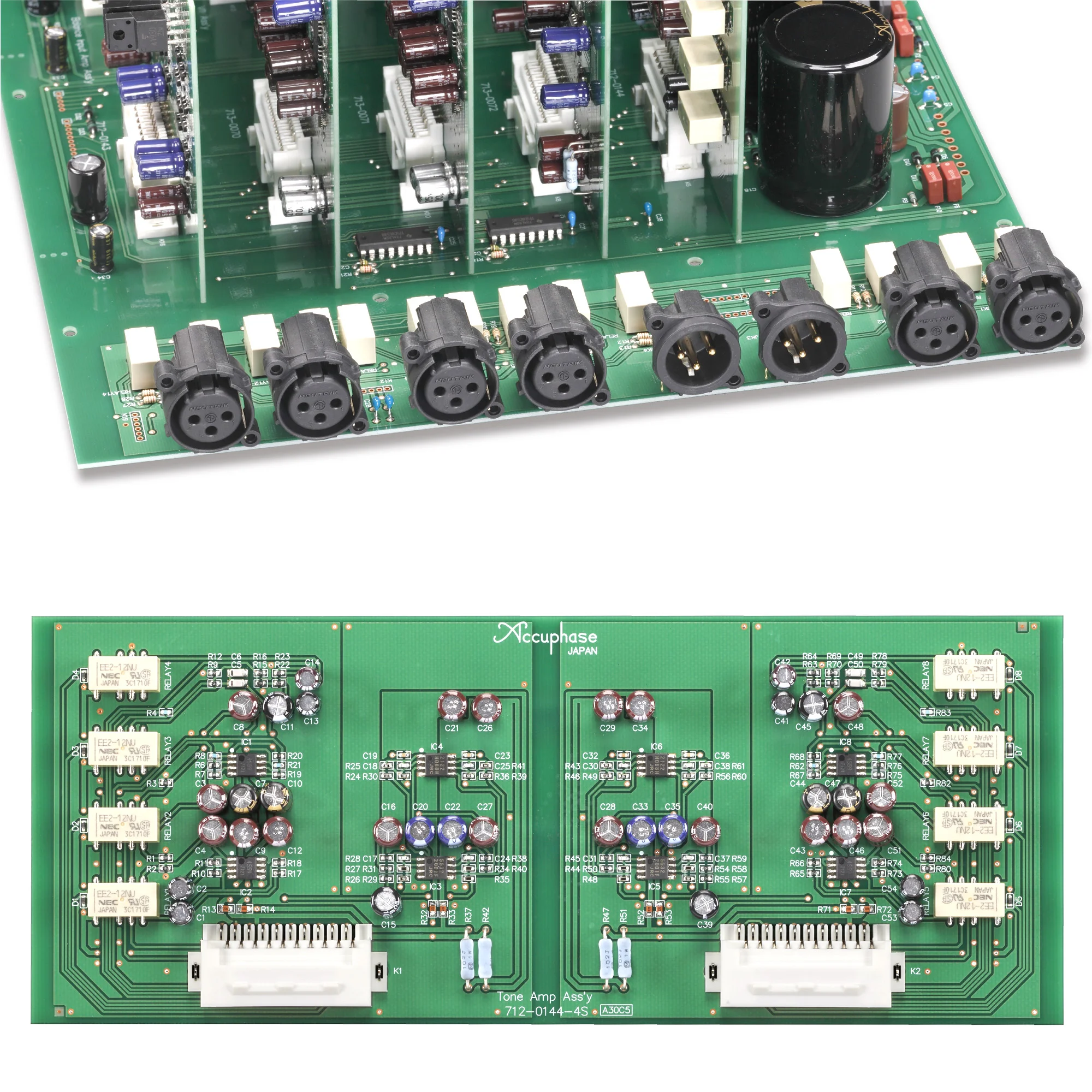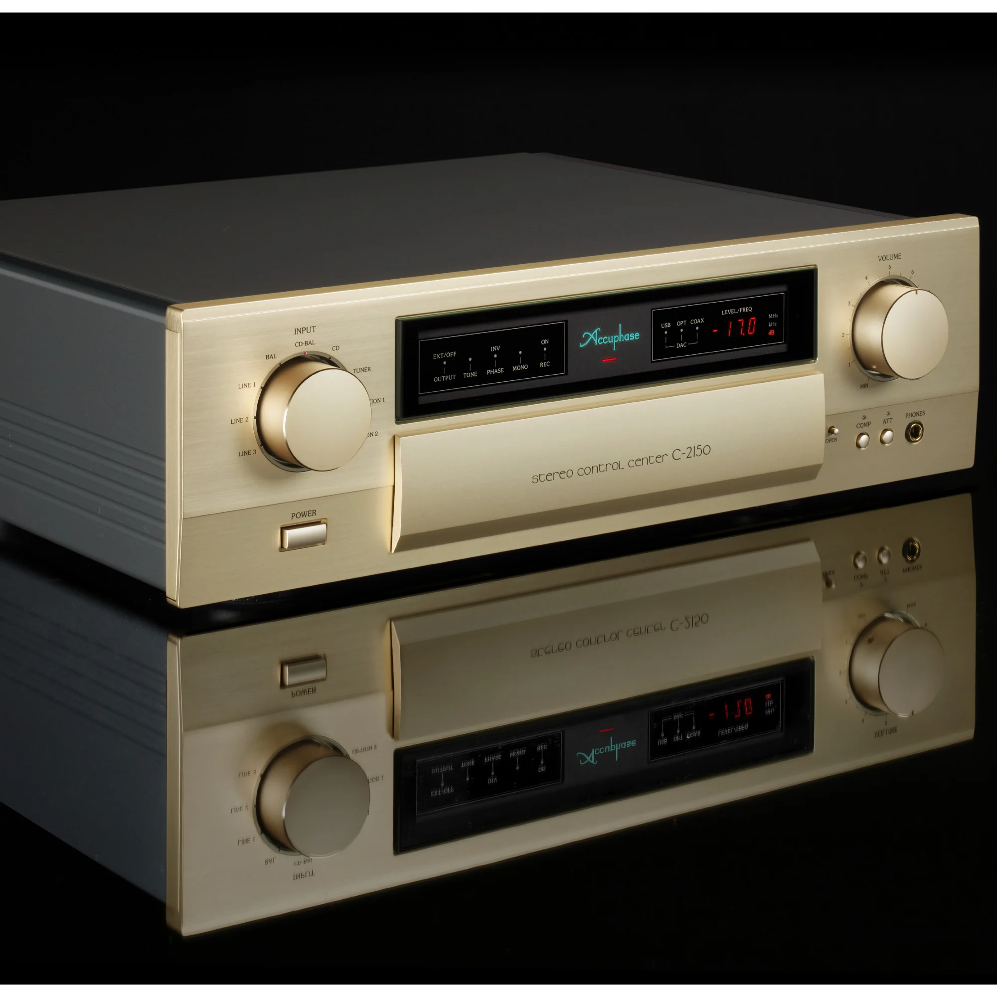 В блоке питания предварительного усилителя Accuphase C-2150 установлены два мощных экранированных трансформатора с фильтрацией 4-мя конденсаторами по 10000 uF каждый. Все платы сделаны из фторуглеродной смолы обладающей очень низкой диэлектрической постоянной и минимальными потерями. Он оснащён переключателем усиления и имеет три положения 12, 18 и 24 Дб. С-2150 оснащён индикацией фазы сигнала. Вы можете выбрать фазу индивидуально для каждого входа. Если индикатор горит - фаза 180, а если индикатор выключен фаза 0.