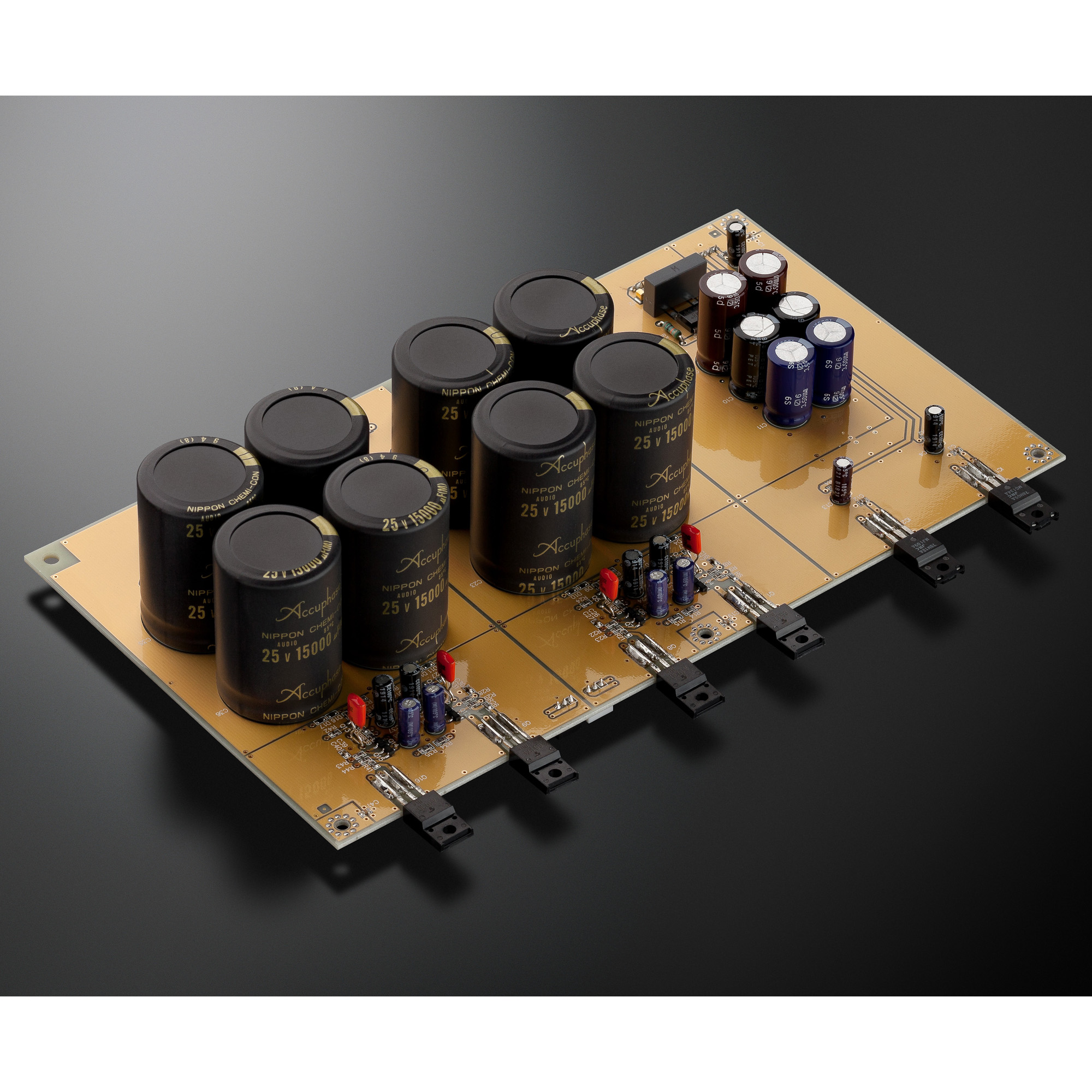Схему блока питания постарались сделать устойчивой к колебаниям нагрузки. Сигнальный тракт выстраивали с расчетом на минимальные изменения и потери. Для более качественного результата были использованы позолоченные печатные платы. В схеме сглаживания используются четыре алюминиевых электролитических конденсатора напряжением 25 В / 15 000 мкФ на канал, специально подобранные с учетом их акустических свойств. Такая конфигурация с широкими габаритами практически исключает негативные последствия пульсаций тока и тому подобного. Использование регулируемой схемы питания с очень низким уровнем шума и отличной регулировкой колебаний нагрузки дополнительно гарантирует, что источник питания не создает никаких помех.