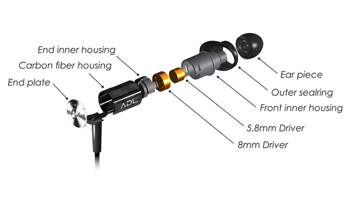 ADL by Furutech EH008 имеют двухполосную конфигурацию и оснащены парой динамических излучателей. Динамик диаметром 8 мм, смонтированный в отдельной камере, предназначен для воспроизведения низких частот. Перед ним установлен излучатель диаметром 5,8 мм для высоких частот. Такое решение обеспечило наушникам равномерный и насыщенный звук в широком диапазоне, не уступающий по качеству лучшим полноразмерным моделям. Излучатели подверглись криогенной обработке Alpha-Cryo для стабилизации их электромеханических характеристик.