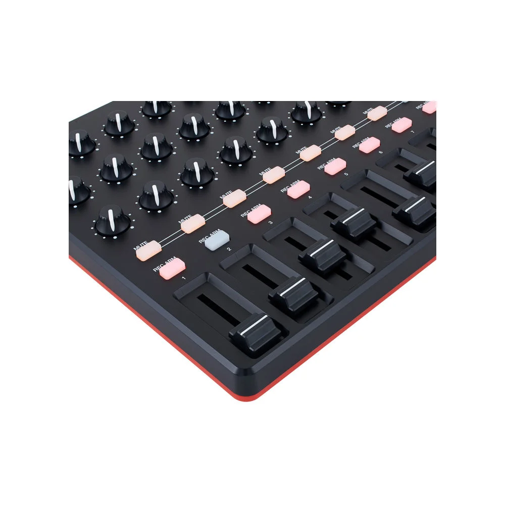 Регулировка параметров производится быстро и просто, интерфейс управления эргономичен и интуитивно понятен. Akai MIDIMIX оснащен восемью отдельными фейдерами и одним мастер-фейдером, предусмотрено также 24 кнопки (по 3 на каждом канале) и 16 клавиш, умноженные на два банка.