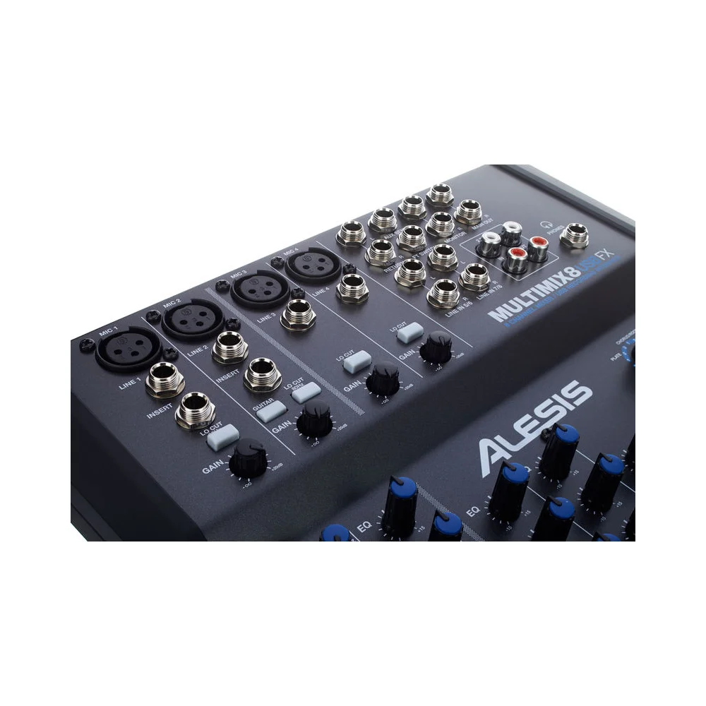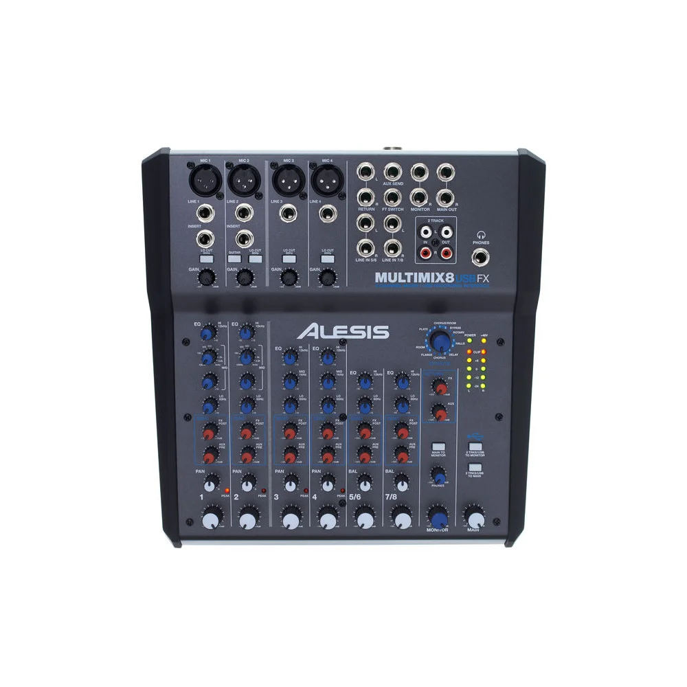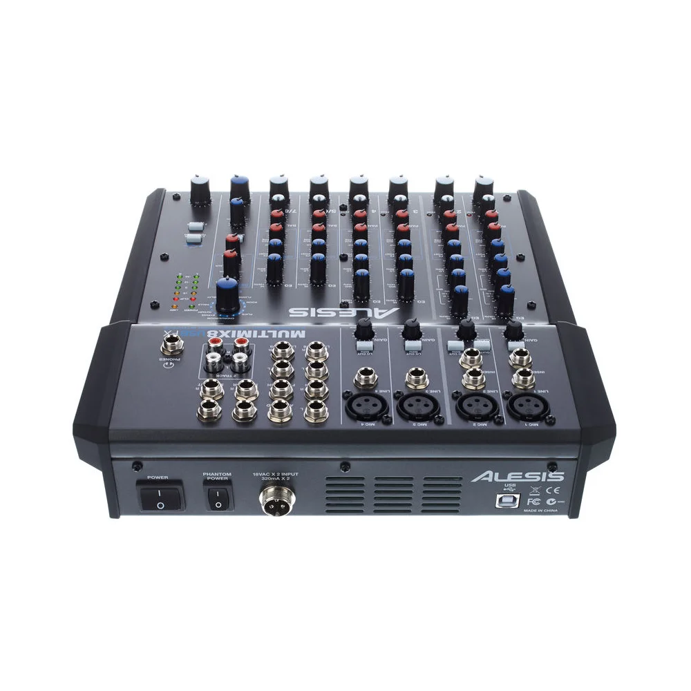 ALESIS MultiMix 8 USB FX – 8-ми канальный микшер с возможностью подключения к компьютеру по USB и процессором эффектов. Компактный вариант для клубов, камерных коллективов, презентаций и других малобюджетных мероприятий. Для тех, кто работает со звуком в студии и дома, и ценит простоту эксплуатации за разумную цену.