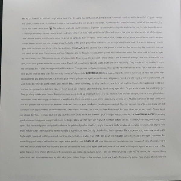 Пластинка наполнена отсылками к литературе, кино и современному искусству от образов Лéона Матильды до экспериментальных ритмических рисунков, вдохновлённых математикой и визуальными паттернами. Отдельного внимания заслуживает звучание: альбом продюсирован с большим вниманием к деталям, а участие струнных музыкантов и камерного хора добавляет композициям атмосферности и эмоциональной насыщенности. An Awesome Wave это не просто набор песен, а цельное аудиопутешествие, которое раскрывается постепенно и каждый раз звучит по-новому, особенно на виниле.