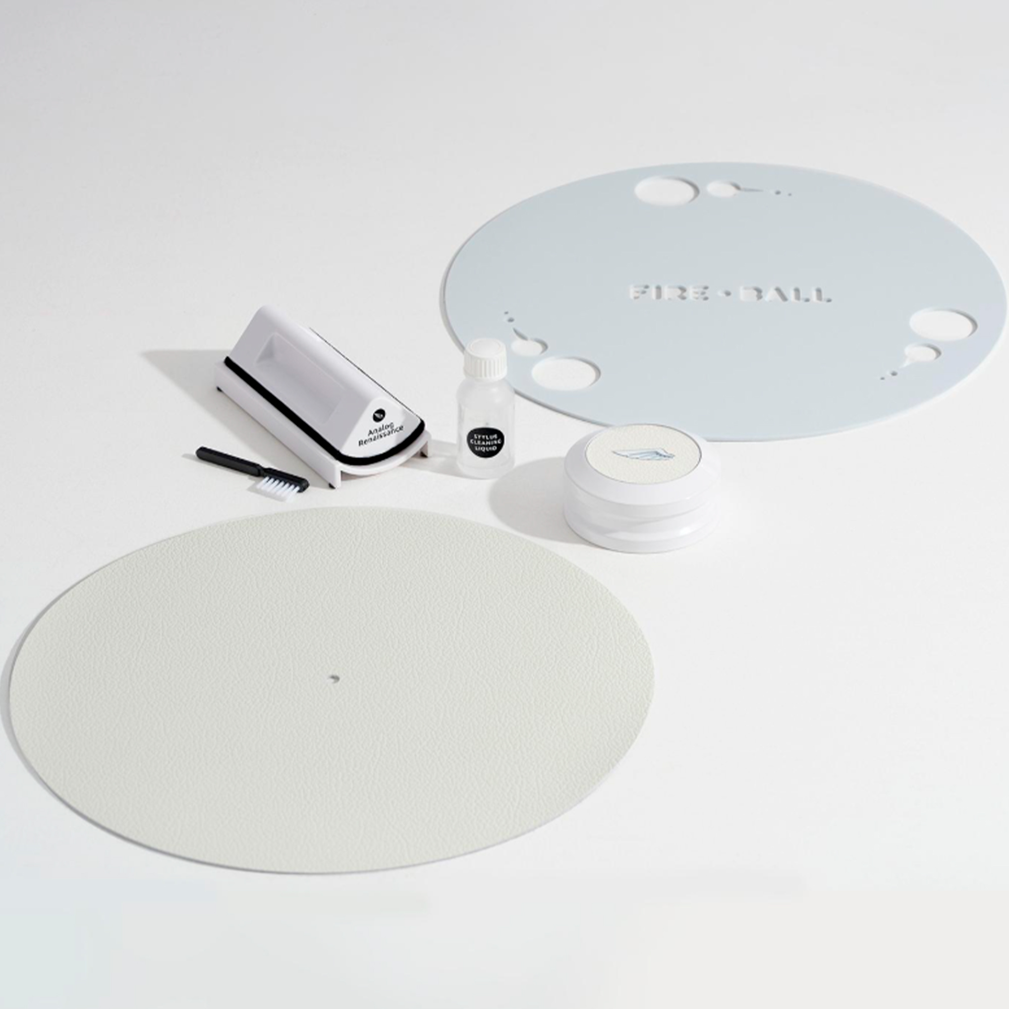 В состав набора входит прижим Mjollnir Clamp для улучшения контакта пластинки с диском, антистатическая вельветовая щётка Record Velvet Brush с щёточкой для её очистки, кожаный слипмат Platter’n’Better и слипмат EVOMAT Fireball для замены штатного, а также бесспиртовая жидкость для чистки иглы звукоснимателя Stylus Cleaning Liquid. Набор позволяет сразу решить несколько задач: улучшить качество воспроизведения, визуально выделить проигрыватель и содержать пластинки и иглу в чистоте.