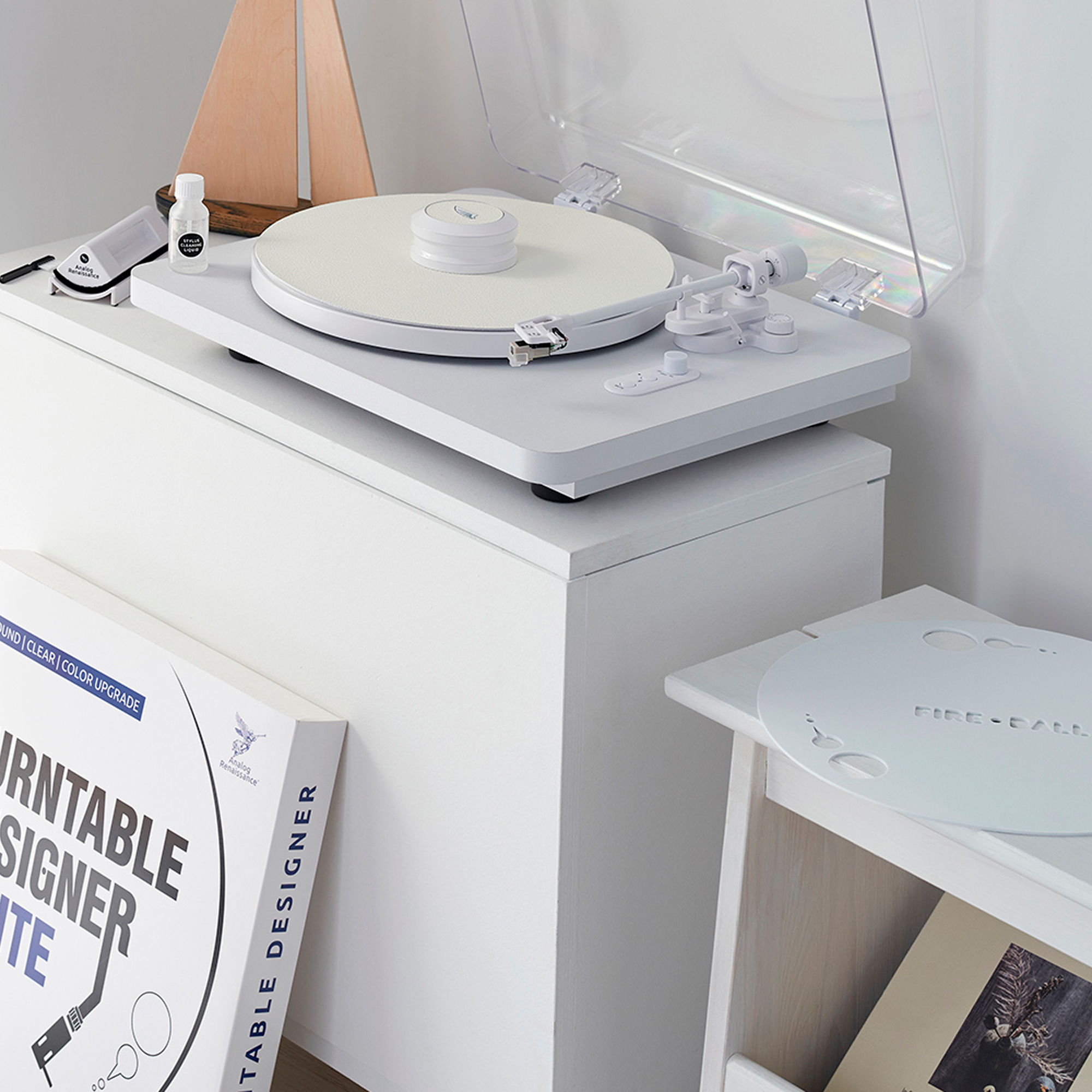 Набор для апгрейда проигрывателя Turntable Designer создан для виниломанов, для которых важен не только звук системы, но и её внешний облик — гармоничное сочетание с интерьером или яркое цветовое пятно. Это концептуальный набор для создания собственного стиля в дизайне проигрывателя и рабочего пространства вокруг него. Он подчеркнёт цвет аудиосистемы (чёрный или белый) и включает аксессуары, улучшающие звучание винила, а также базовые средства для поддержания пластинок и иглы в чистоте.