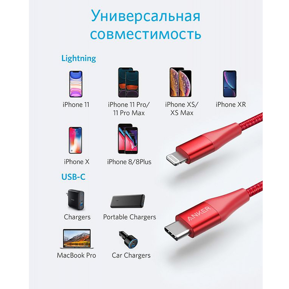 Anker PowerLine+ II USB-C - Lightning - USB-кабель для iPhone 8, 8 Plus, X, XS, XR, XS Max, iPad Pro (10,5 дюйма), iPad Pro (12,9 дюйма) 1-го поколения, iPad Pro (12,9 дюйма) 2-го поколения, поддерживает подачу питания (для использования с зарядными устройствами типа C).