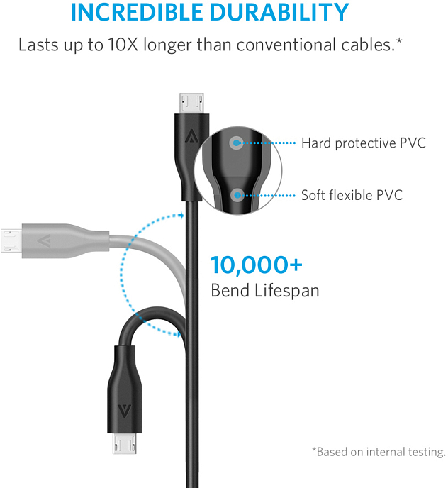 Anker Powerline (A8132H12) представляет собой кабель для зарядки и синхронизации любых устройств, оснащенных разъемом microUSB. С ним вы сможете заряжать мобильные девайсы от вашего компьютера, ноутбука или сетевого зарядного устройства. Исследования, проведенные производителем, показали, что кабель выдерживает более 5000 циклов сгибания/разгибания без потери работоспособности.