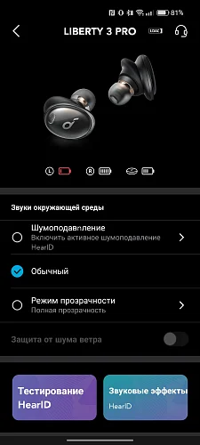 HearID ANC анализирует ваш слуховой профиль и уровень давления в ушах, чтобы создать индивидуальный профиль, который оптимизирует шумоподавление и снижает внешний шум так, как комфортно именно вам. Пользователю также доступны три режима прозрачности, которые подстраиваются под окружающую обстановку.