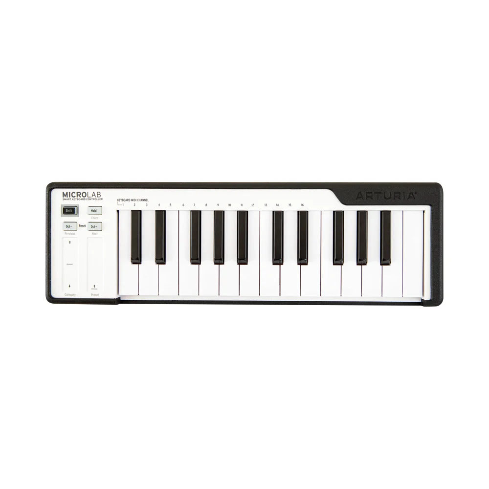Всего 4 кнопки и 2 сенсорные полосы обеспечивают отличную управляемость MicroLab. Кнопка «Hold» обеспечивает функцию педали сустейна, а при нажатии её вместе с клавишей «Shift» вы получаете доступ к режиму «Chord», позволяя вам программировать аккорды и воспроизводить их одним нажатием. MicroLab также оснащен емкостными сенсорными полосами модуляции и высоты тона, которые позволяют пролистывать и выбирать пресеты в одно касание.