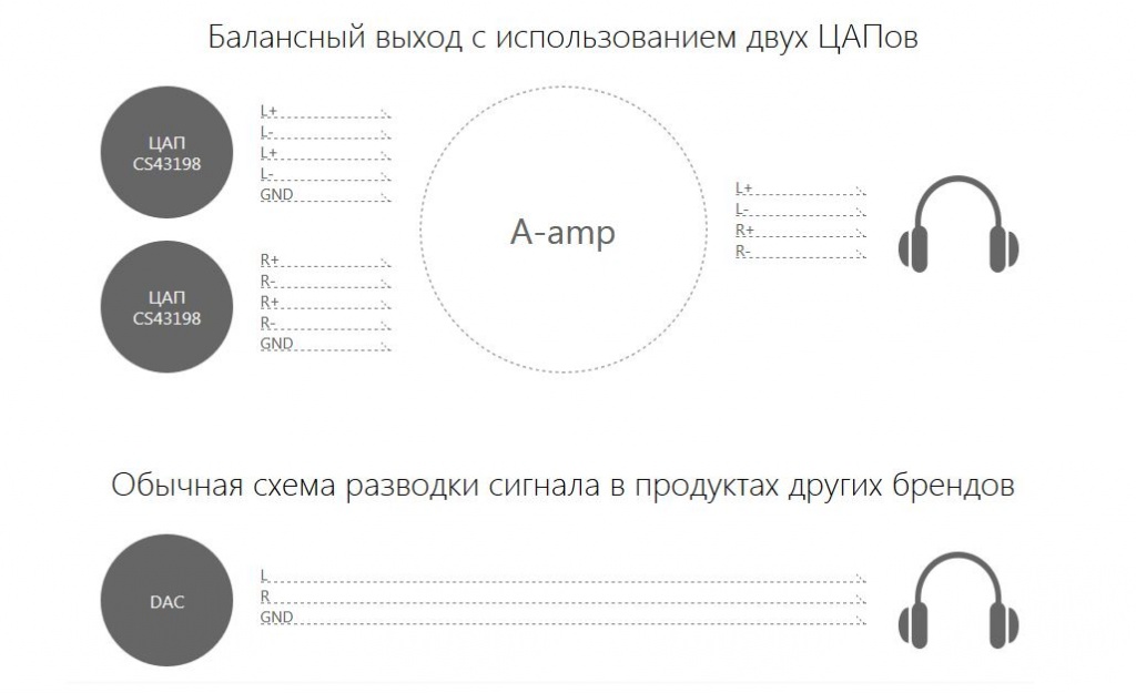 - выходное сопротивление - Phone out 3,5 мм (1,6 Ом) / Балансный выход 2,5 мм (1,1 Ом);