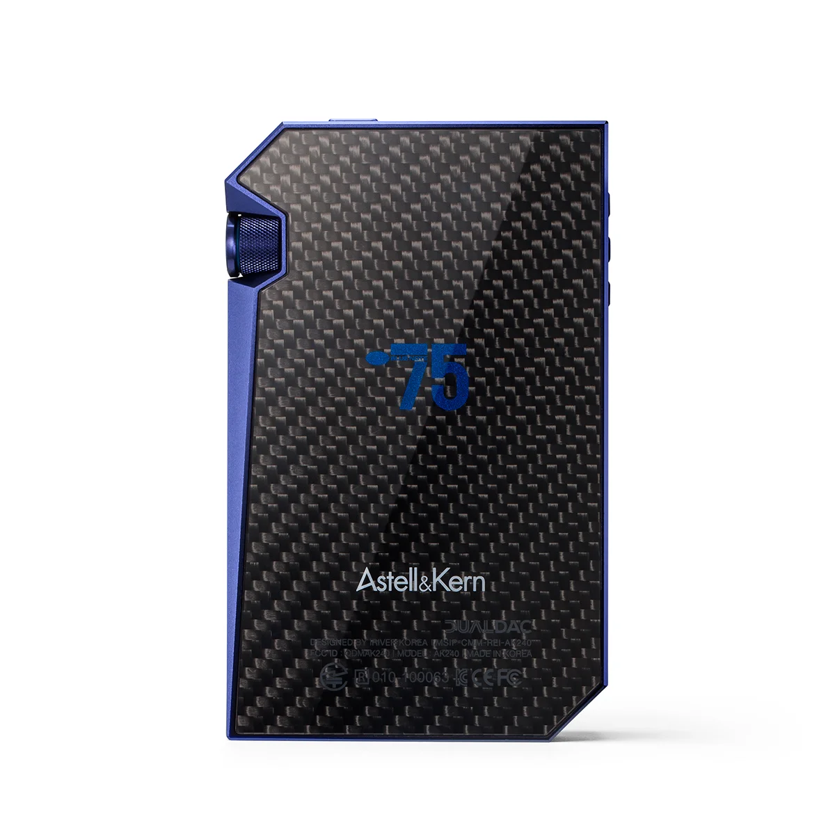- Портативный Hi-Fi-плеер Astell&Kern AK240 выполнен в ярко-синем цвете с символичной цифрой 75 на задней панели и поставляется в комплекте с чехлом цвета морской волны