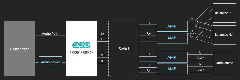По умолчанию в плеер установлен модуль SEM1 с одним 8-канальным чипом ESS ES9038PRO — чаще всего он встречается в стационарной Hi-Fi технике премиального сегмента. ЦАП способен обрабатывать аудио с разрешением до 32 бит/384 кГц и DSD256 с широким динамическим диапазоном и детальной проработкой звука. Для подключения наушников модуль предусматривает как стандартный выход 3.5 мм, так и балансные 2.5 мм и 4.4 мм.
