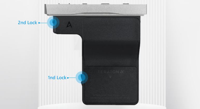 Первый замок соединяет модуль и корпус, второй — надежно фиксирует оба элемента в единую конструкцию. Подпружиненные внутренние разъемы основного корпуса обеспечивают надежное соединение и предотвращают сбои в подаче аудиосигнала в случае внешнего удара по плееру во время движения.