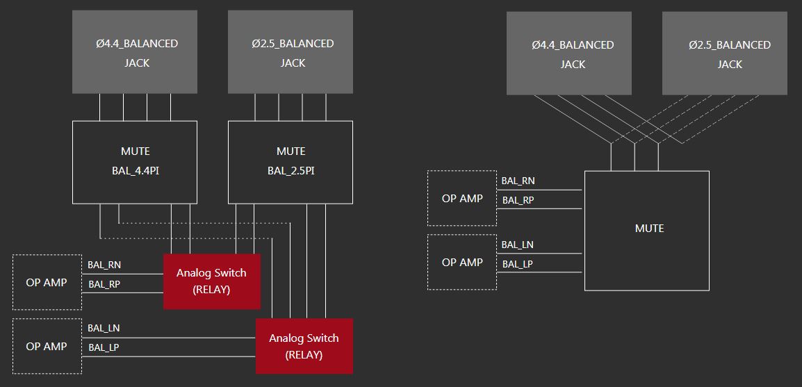 Балансный выход 4.4 мм встречается и в других портативных плеерах, однако самая важная часть - это то, как он реализован в ALPHA. В отличие от других производителей, в Kann ALPHA физически разделены выходы 2.5 мм и 4.4 мм с помощью микро реле. В других продуктах при подключении к 2.5 мм и 4.4 мм используется общая цепь отключения и не предотвращает шумовые помехи, потому что каждый сигнал не заблокирован должным образом. Kann ALPHA может похвастаться бесшумным выходом, потому что в нём построена независимая схема, которая полностью блокирует помехи от не используемых выходов, что в свою очередь предотвращают возникновение шума.