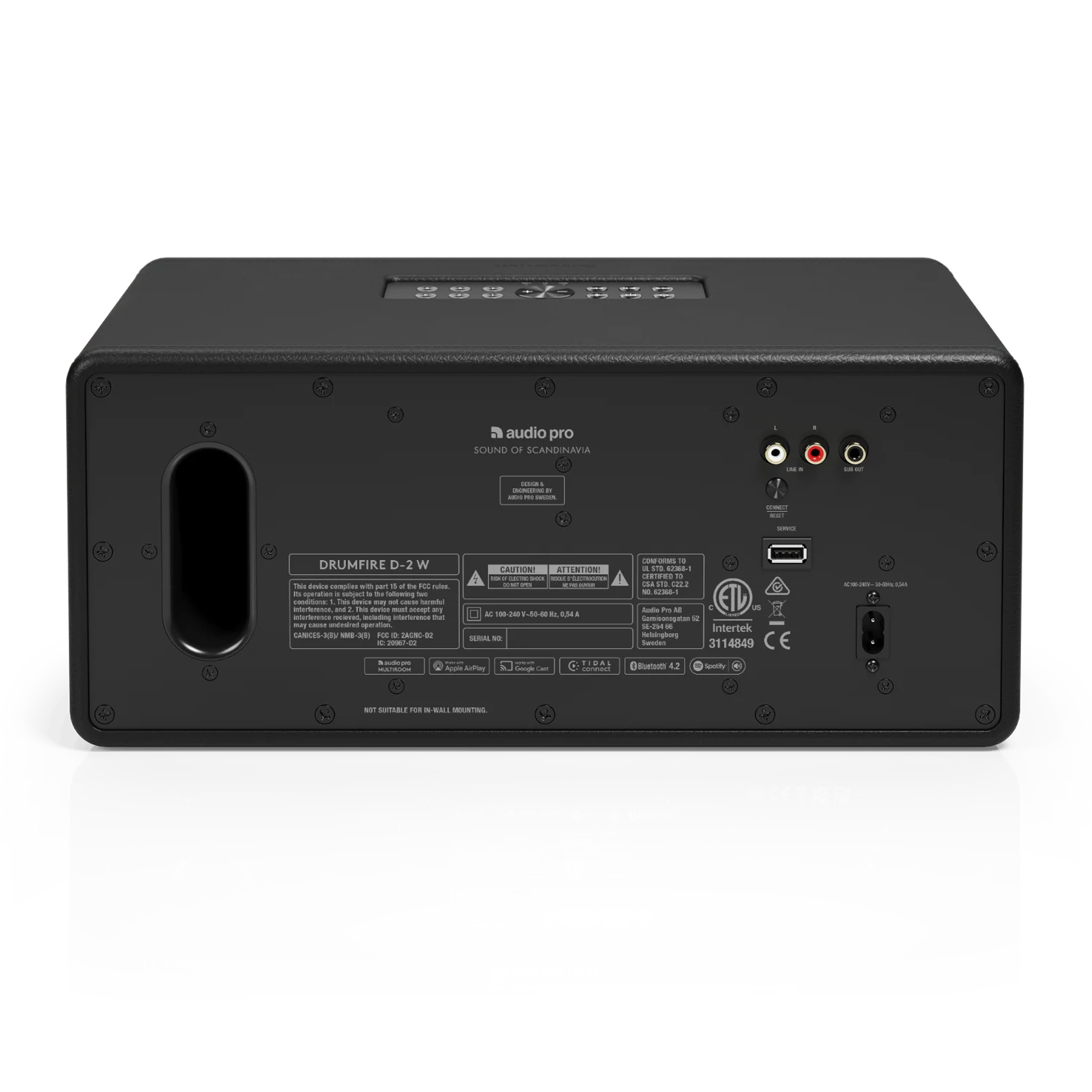 Модель имеет конфигурацию 2.1, которая в данном случае реализована довольно необычно. Два ее басовика диаметром 4,5 дюйма включены параллельно и работают от усилителя мощностью 60 Вт. Такое решение позволило получить довольно глубокие басы, как от НЧ-динамика большего диаметра, но при сохранении компактных размеров корпуса. Басовики работают совместно с фазоинвертором, выходное отверстие которого выведено на заднюю панель. Два твитера, размещенные по краям фронтальной панели Audio Pro Drumfire D-2, обеспечивают широкую звуковую картину. Мощность усилителей для каждого из них составляет по 20 Вт.