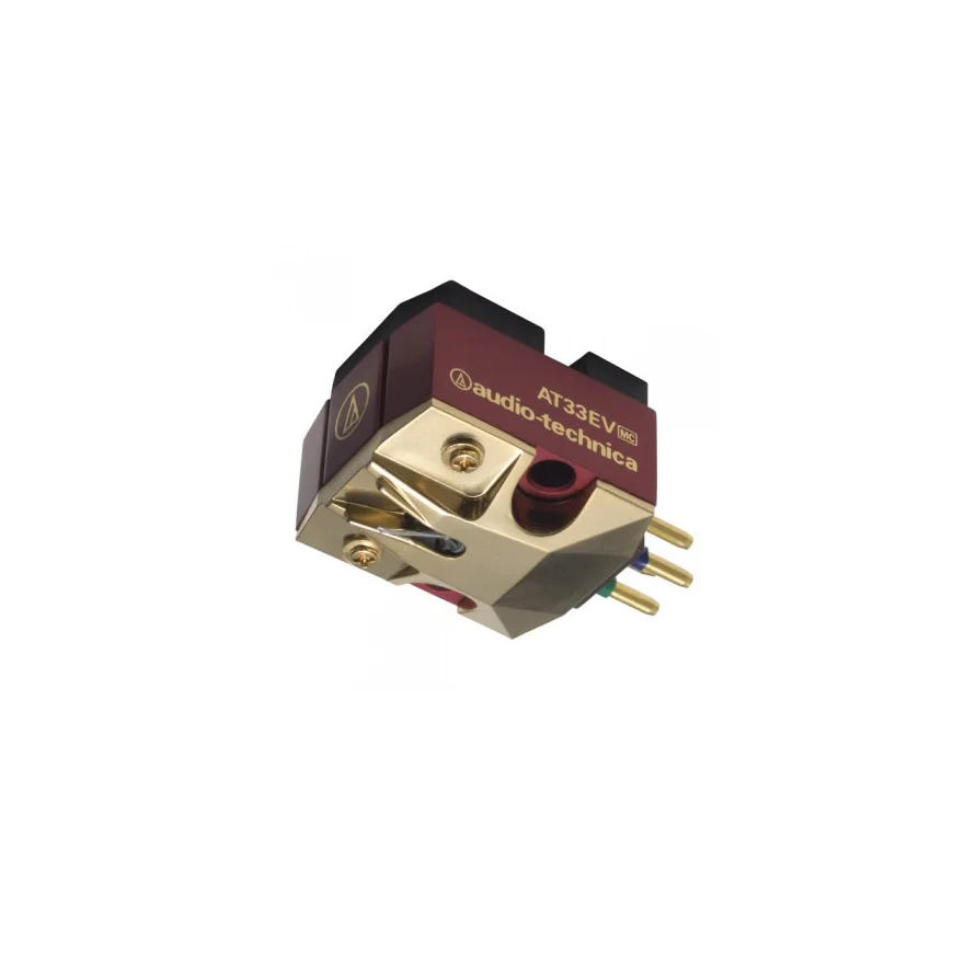 Головка звукоснимателя с подвижной катушкой AT33EV занимает в линейке компании Audio-Technica достаточно высокое положение. Более широкий, по сравнению с обычными стандартными головками, прямоугольный алюминиевый корпус картриджа Audio-Technica AT33EV вмещает в себя сразу две цилиндрические катушки, расположенные под некоторым углом друг к другу. Благодаря такому ноу-хау удалось добиться довольно высокого показателя разделения каналов, который составляет 30 дБ, а также увеличить верхний предел частотного диапазона до 50000 Гц и в итоге получить более чистое и ровное звучание. Для крепления головки к шеллу используются два латунных винта (с гайками), расстояние между которыми равно половине дюйма (около 13 мм). В верхней и нижней части корпуса имеются вставки из специальной синтетической смолы, способствующие подавлению паразитных резонансов. В модели Audio-Technica AT33EV используется алмазная игла с обычным эллиптическим профилем (0,3 х 0,7 мм), закрепленная на устойчивом к механическим деформациям дюралюминиевом кантеливере, выполненном в виде прочной конической трубки. Особый демпфирующий материал Hanenite на основе резины используется внутри корпуса, а также в точке крепления кантеливера для снижения нежелательных вибраций. В системе преобразователя задействованы мощные редкоземельные (неодимовые) магниты. Провода катушек выполнены из бескислородной меди высокой степени очистки (Pure Copper Ohno Continuous Casting (PCOCC)) с монокристаллической структурой для обеспечения требуемых характеристик. Такая медная проволока изготавливается особым способом, подвергаясь процессу непрерывной вытяжки из расплава. Уровень выходного сигнала картриджа Audio-Technica AT33EV равен всего 0,3 мВ (при 3,54 см/сек). Поэтому для данной головки рекомендуется использовать фонокорректор с высоким коэффициентом усиления и входным импедансом в 100 Ом. Отличным вариантом в данном случае станет применение повышающего трансформатора. Оптимальный диапазон прижимной силы находится в пределах от 1,8 до 2,2 г. Вес модели составляет 6,9 г, что позволяет ей нормально работать с большинством современных тонармов.