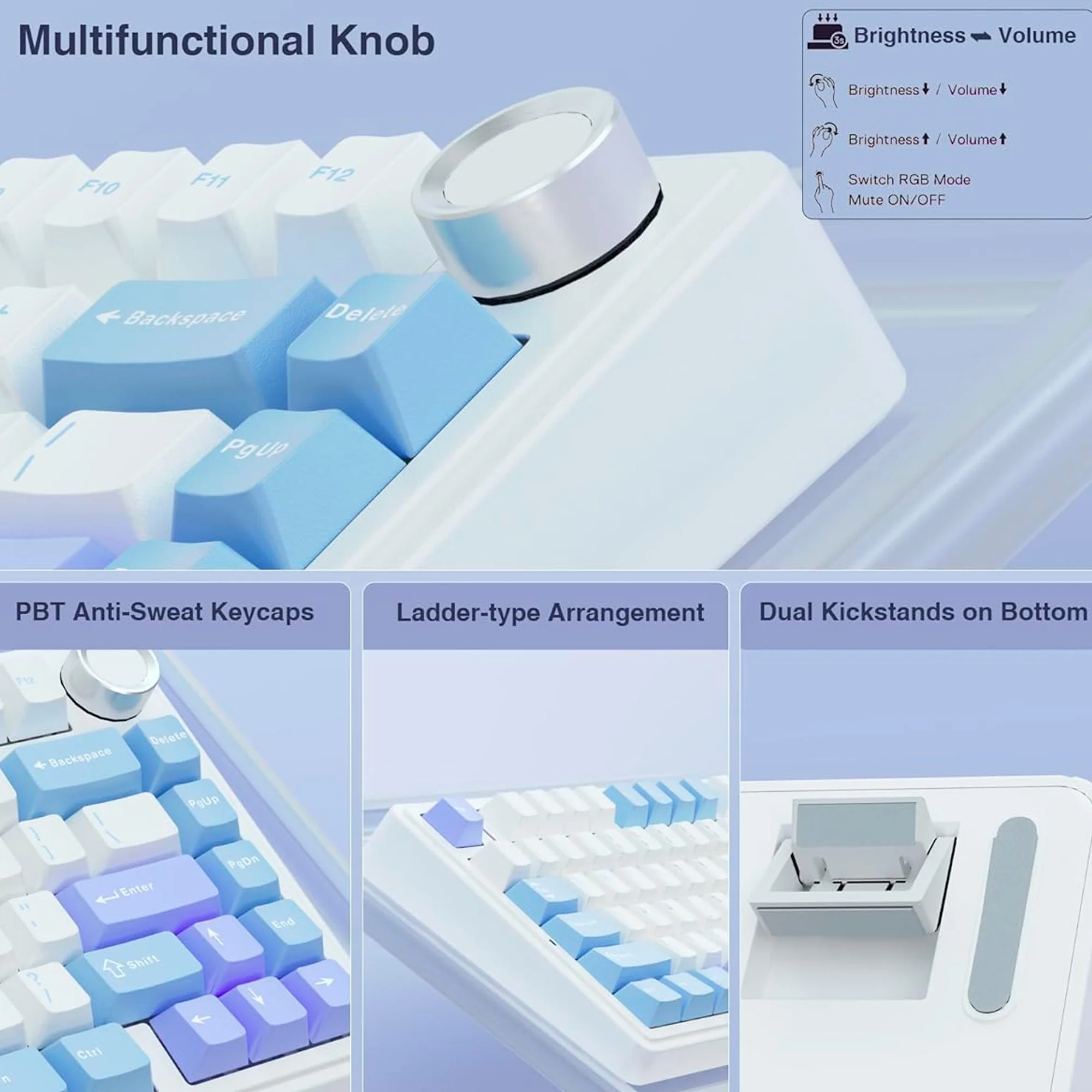 Устройство поддерживает три режима подключения: проводной через USB, Bluetooth и беспроводной режим 2.4 ГГц. Такая универсальность позволяет использовать клавиатуру с разными устройствами — от ПК до ноутбуков и планшетов, выбирая оптимальный способ соединения в зависимости от ситуации.