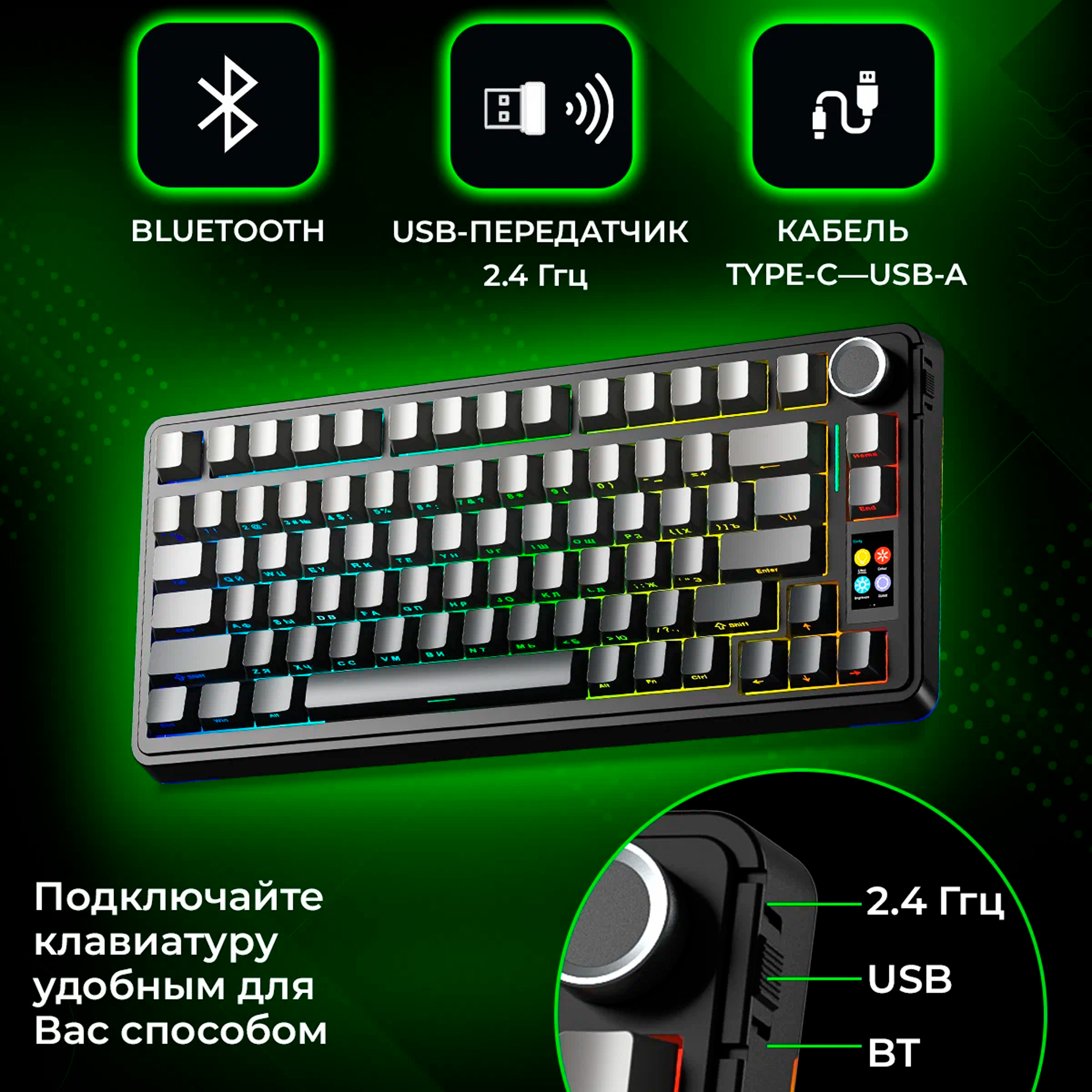 Устройство предлагает максимальную гибкость подключения: вы можете выбрать надёжное проводное соединение через USB или воспользоваться беспроводной свободой. Для связи без проводов доступны два варианта - стабильный радиоканал с минимальной задержкой для игр и универсальный Bluetooth для подключения к ноутбуку, планшету или смартфону. Встроенный аккумулятор обеспечивает 80 часов без световых эффектов, избавляя от необходимости в частой подзарядке.