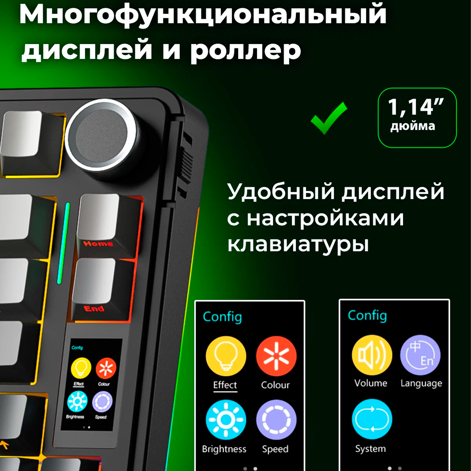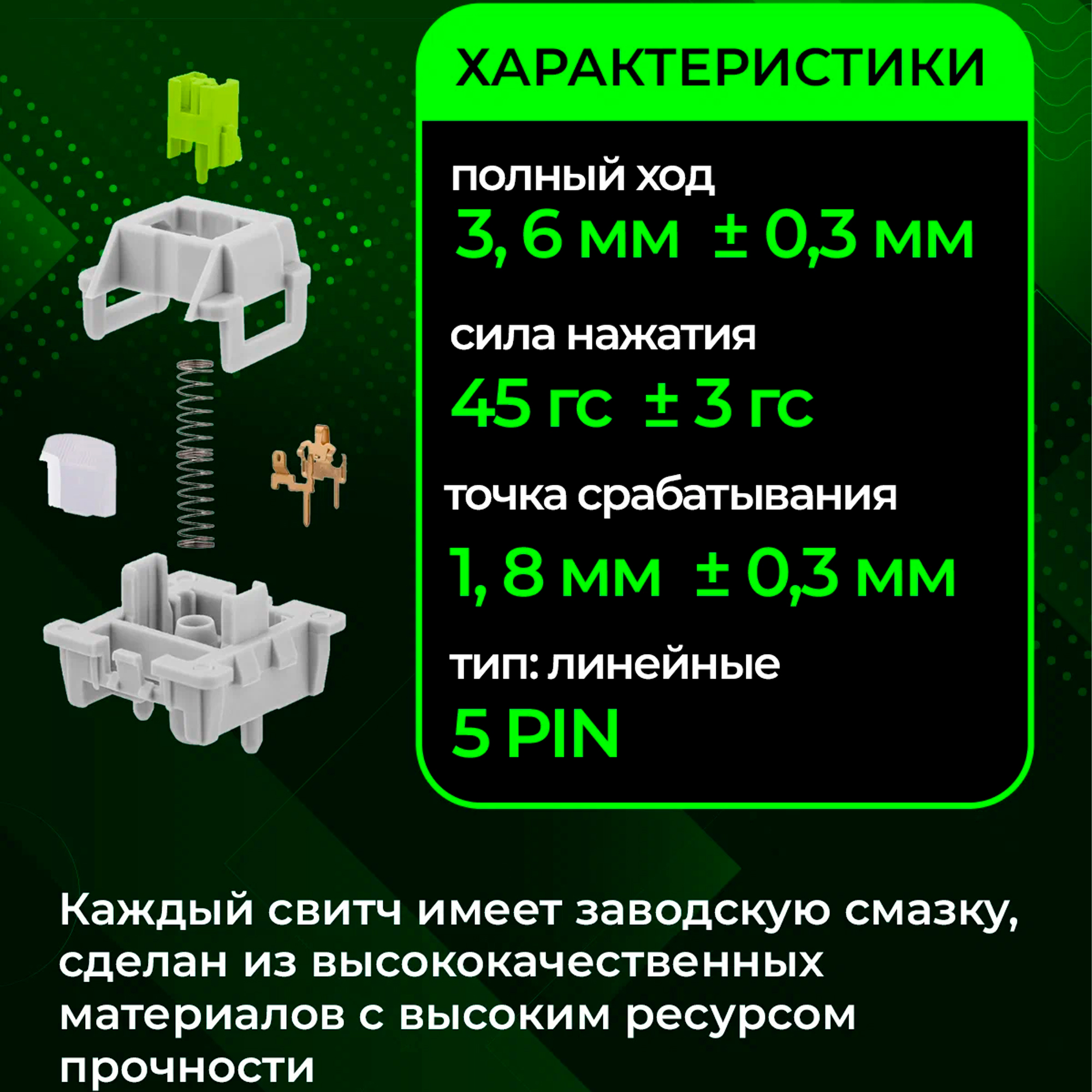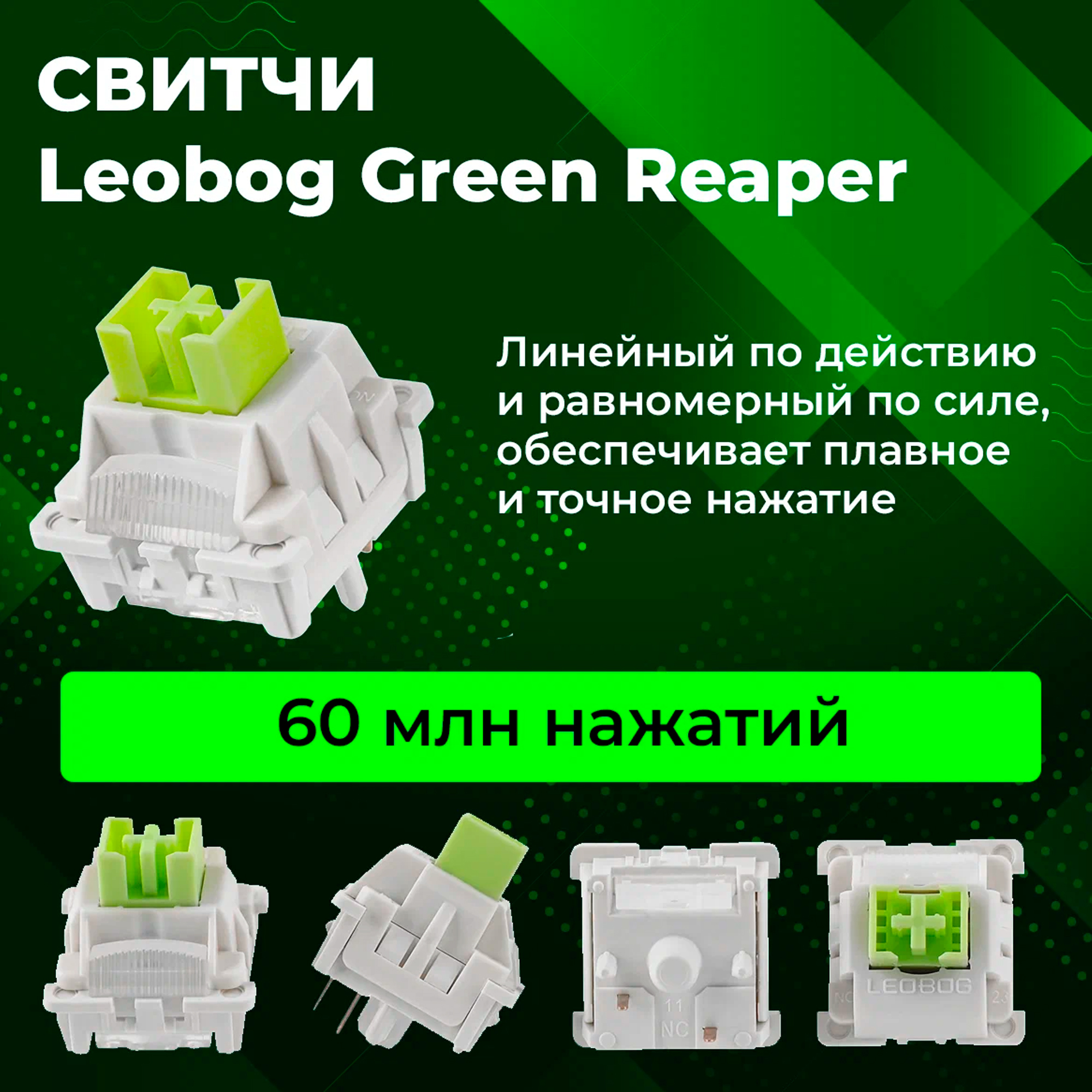 Механические переключатели Reaper Green с линейным характером срабатывания гарантируют молниеносный и плавный отклик каждой клавиши. Важным преимуществом является поддержка технологии Hot Swap, позволяющей без пайки менять переключатели на другие, что открывает безграничные возможности для индивидуальной настройки тактильных ощущений под свои предпочтения. Восемьдесят клавиш с боковой гравировкой символов выглядят необычно и стильно, а под ними скрывается яркая настраиваемая RGB-подсветка, способная создать уникальную атмосферу.