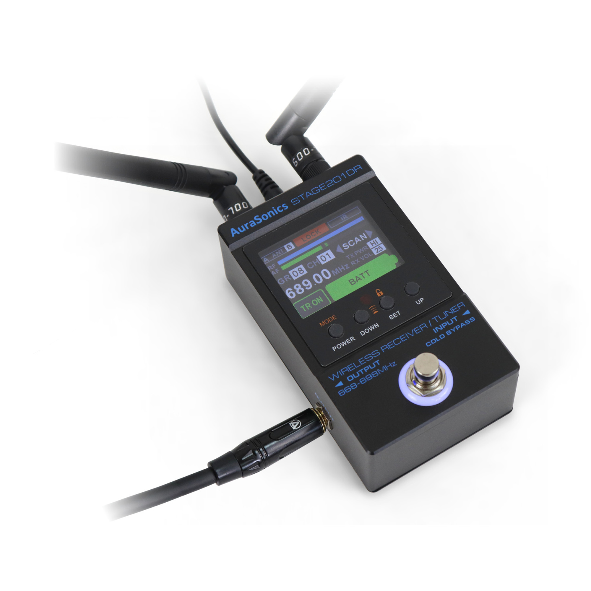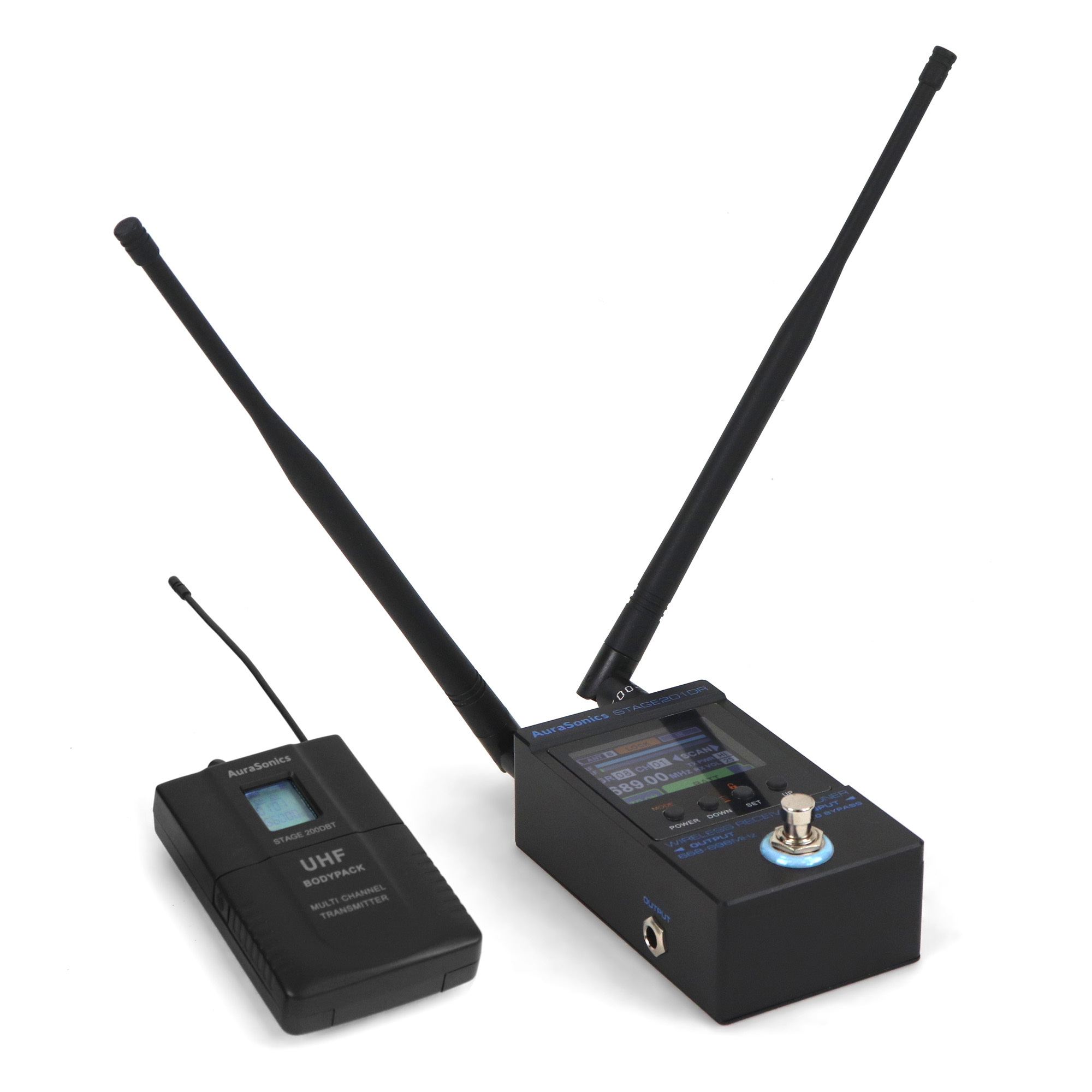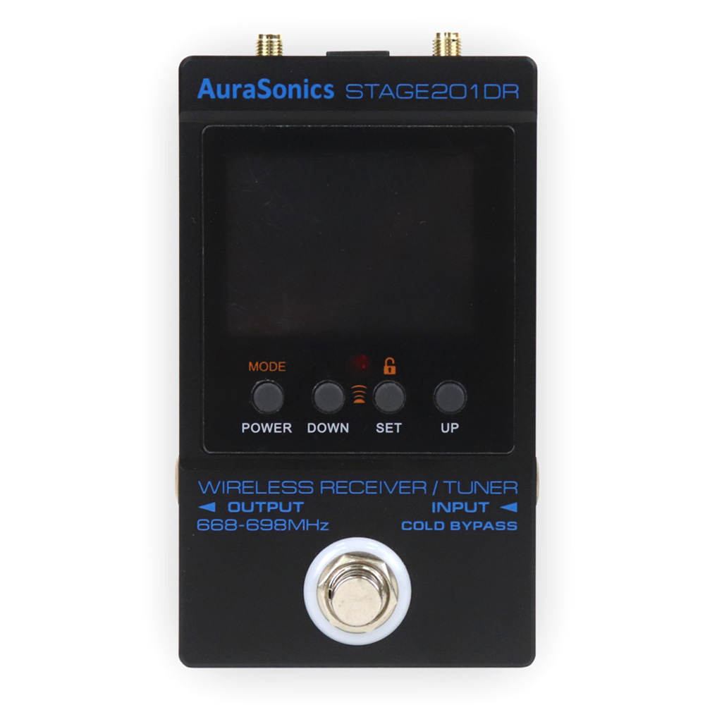 Одноканальный цифровой приёмник AuraSonics STAGE 201DR GUITAR работает в диапазоне частот 668-698МГц. Для защиты от потери сигнала в следствие переотражений радиоволн и интерференции применяется разнесённый приём на 2 антенны. Активная в данный момент антенна отображается на дисплее. Частоты объединены в 10 групп с 30 предустановленными настройками в каждой, шаг частот составляет 100 кГц. Приёмник отображает состояние заряда батареи передатчика и выключения передатчика Mute. Два линейных графических индикатора показываются уровень радиочастотного и звукового сигнала.