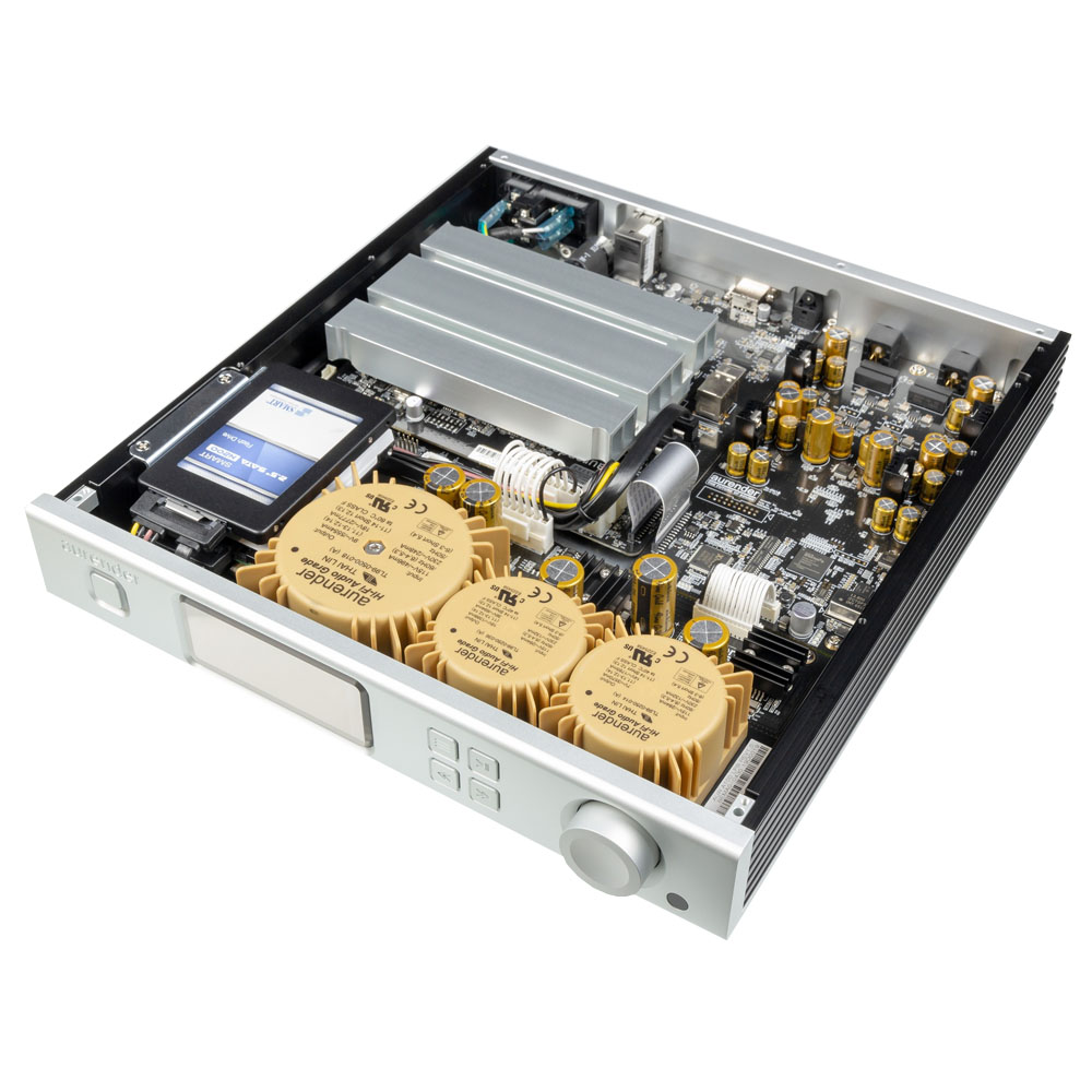 Модель Aurender A100 2Tb обладает линейным БП, который отличается высокоэффективной системой экранирования и включает в себя три тороидальных трансформатора, соответственно, для раздельного питания цепей музыкального сервера, цифровых контуров и ЦАПа. Благодаря такому мощному экрану удается избавиться от проникновения шумов и помех к цифро-аналоговому конвертеру и к подключенным к проигрывателю компонентам.