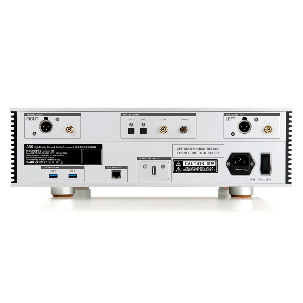 A30 — флагманская модель в линейке производимых фирмой Aurender аудиоплееров с аналоговым выходом. Подобно плеерам A10 и A100, A30 по своей сути является кэшируюшим на SSD диск аудиосервером / стримером c ЦАПом с встроенным хранилищем и управляется через приложение Aurender Conductor. Кроме того, Aurender A30 оснащен MQA-декодером, позволяющим воспроизводить даже потоковые файлы MQA в полном разрешении, что обеспечивает звучание, соответствующее студийной мастер-записи по качеству, т.е. наивысшее. Впрочем, среди конкурентов A30 выделяется не только уровнем аудио параметров, но и разнообразием функциональных возможностей. Он спроектирован как всеобъемлющий центр цифровой аудиосистемы, т.к. наделен способностями, обычно не присущими типичному аудиосерверу. Он может переписывать данные с компакт-дисков, оснащен высококлассным усилителем для наушников, HDD-накопителем на 10 Тб, увеличенным цветным LCD-дисплеем, а также отдельным приложением для редактирования мета-данных записи CD на внутреннее хранилище . Благодаря всему этому — и многому другому —A30 олицетворяет новые стандарты качества и возможностей универсальных источников цифрового аудио.