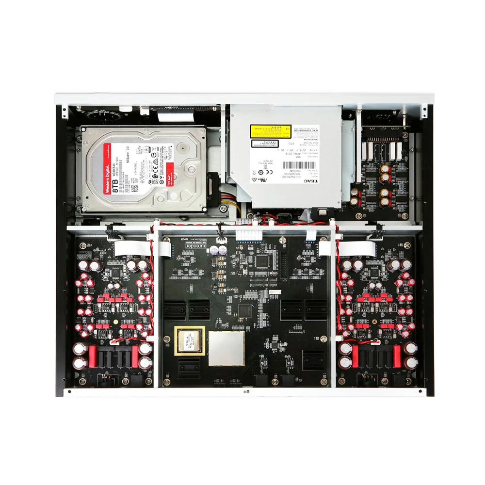 Встроенный жесткий диск (HDD-накопитель) предоставляет 10 Тб для хранения файлов, а для их кэширования перед воспроизведением предусмотрена твердотельная системная память объемом 480 Гб. Если выбранный трек или альбом уже перенесены в системную память, HDD-накопитель не задействуется, тем самым снижается износ жесткого диска. Кэширование треков в системной памяти перед воспроизведением позволяет полностью избавиться от помех, создаваемых HDD-накопителем при вращении диска, движении считывающих головок и работе электродвигателя.