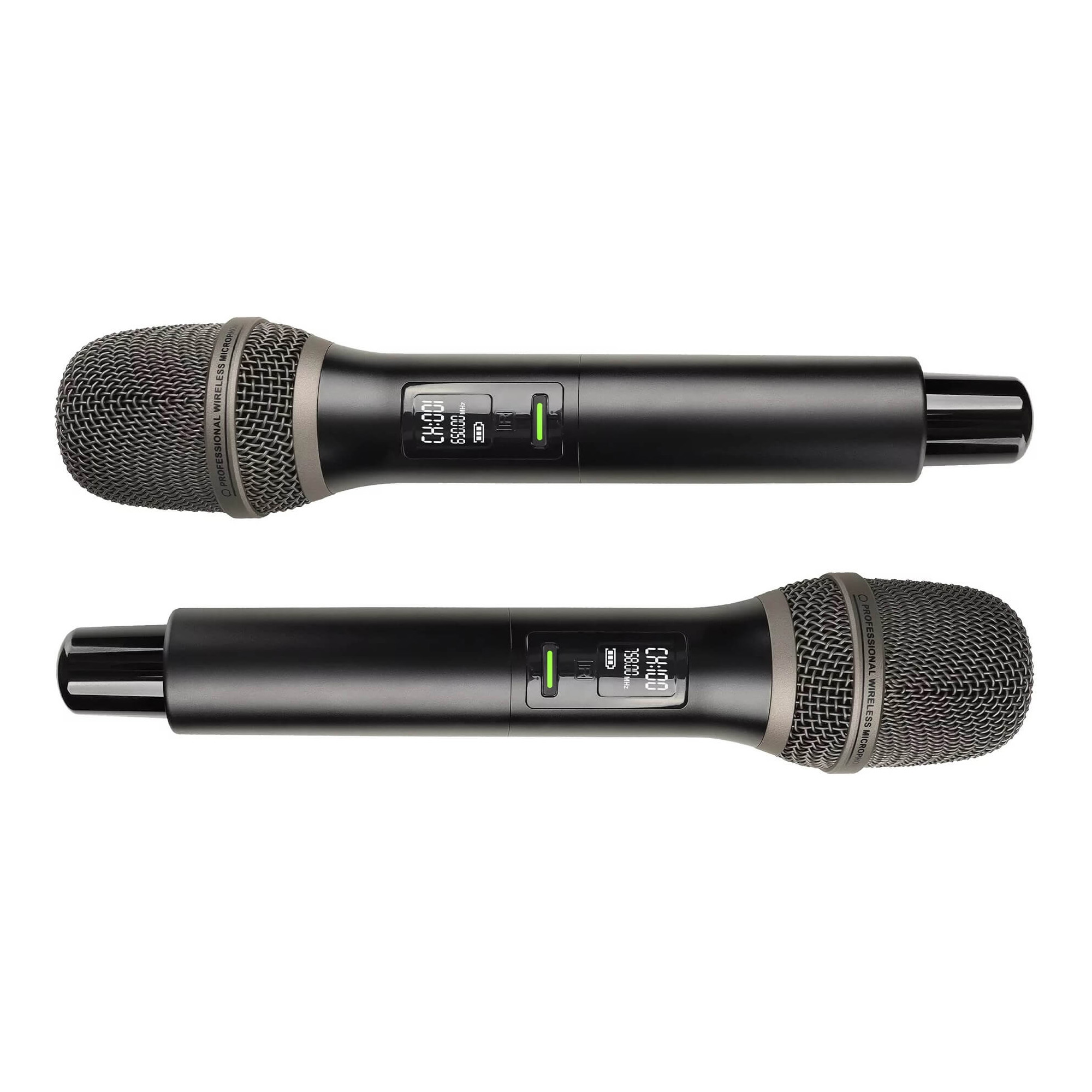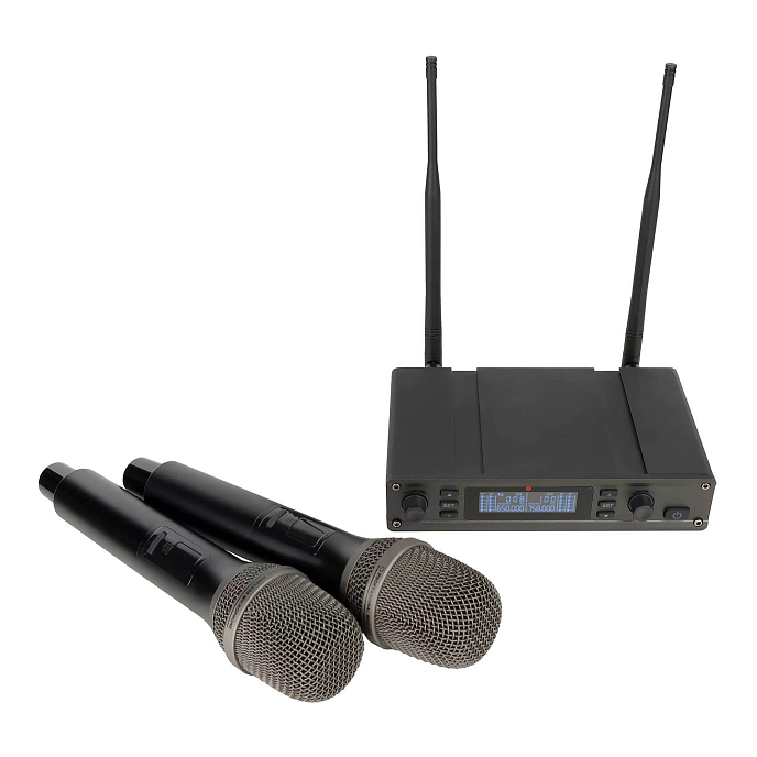 Двухканальная беспроводная цифровая вокальная радиосистема профессионального уровня с DSP, с функцией подавления обратной связи (Anti feedback), состоящая из двух ручных микрофонов и двухканального приемника