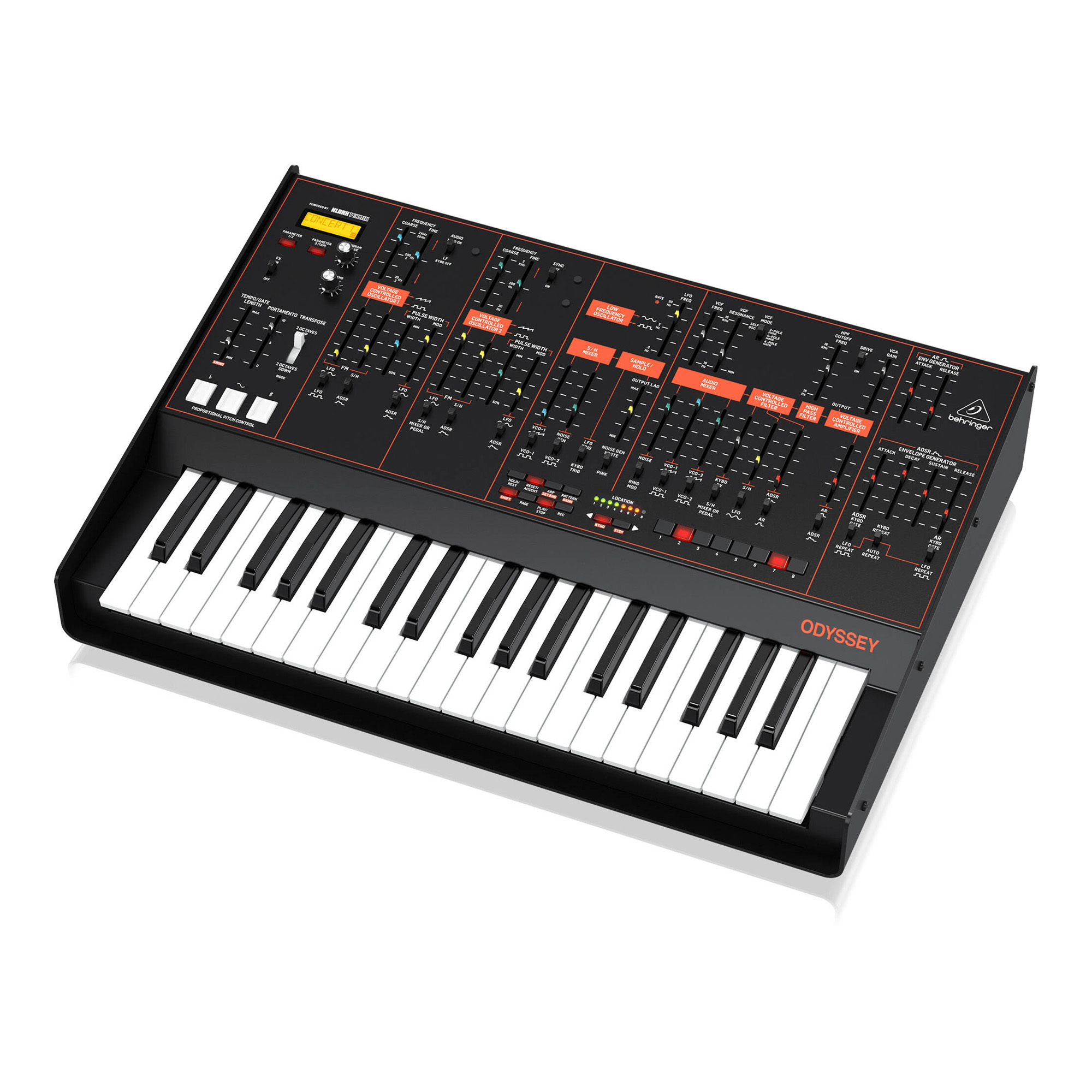 Behringer Odyssey - модернизированный клон легендарного синтезатора ARP Odyssey, появившегося в 1972 году. Это дуофонический аналоговый синтезатор с двумя осцилляторами и широким диапазоном возможных характеров звучания. Он оснащен кольцевой модуляцией, возможностью синхронизации осцилляторов, функцией sample & hold, модуляцией ширины импульса, двумя генераторами огибающей и тремя типами фильтра, заимствованными у трех моделей ARP ODYSSEY: 12 дБ 4023 от первой модели, 24 дБ 4035 от MK2 и 24 дБ 4075 от третьей модели. Управление параметрами осуществляется с помощью множества фейдеров на передней панели. Behringer добавили ряд новых функций, включая секвенсор на 64 секвенции (8 банков по 8 секвенций до 32 шагов), арпеджиатор, порты USB и MIDI, а также мощную секцию цифровых эффектов с небольшим дисплеем. Секция включает в себя 45 эффектов с памятью. Синтезатор оснащен балансным XLR и небалансным 1/4” выходами, а также CV Gate и CV Trig входами и выходами.