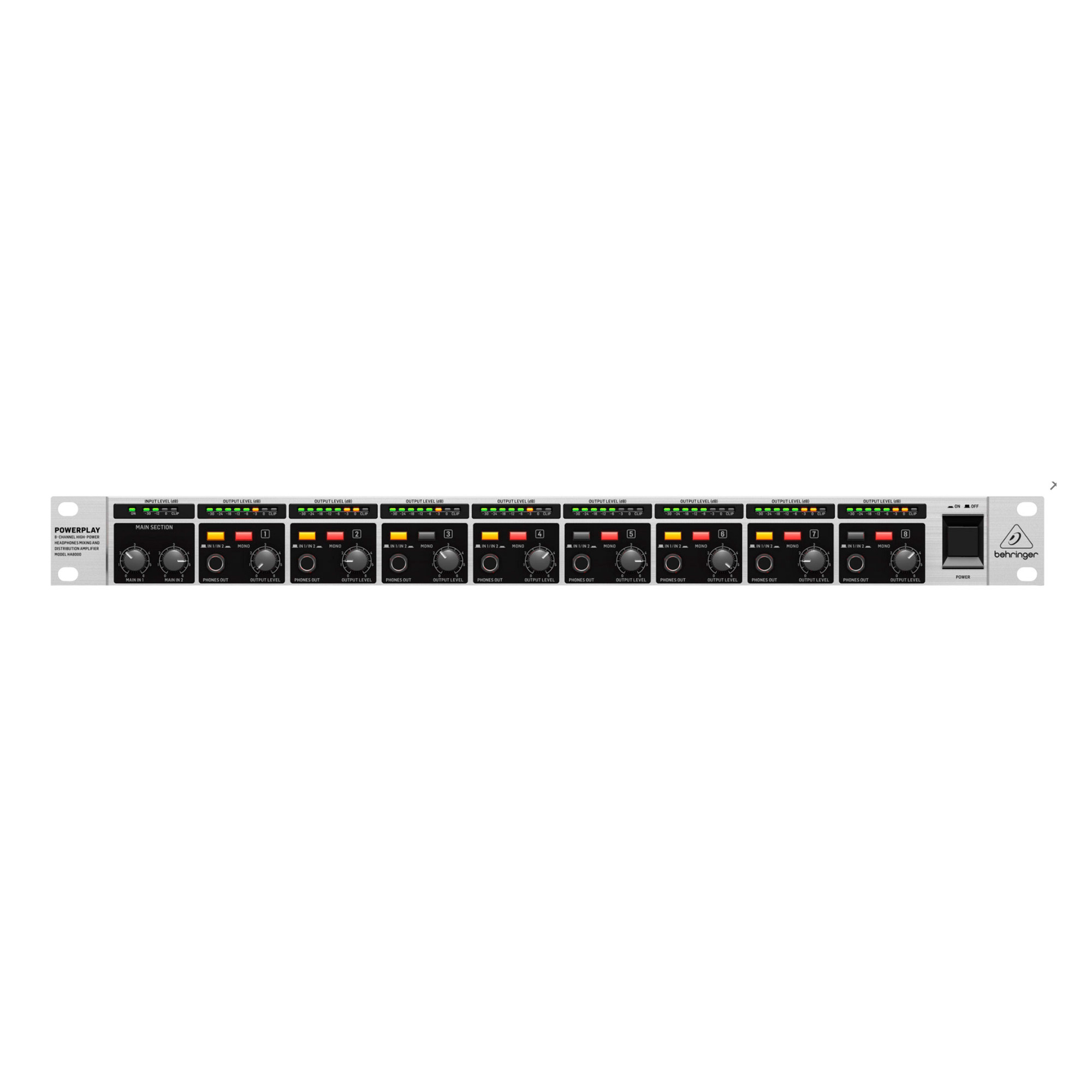 HA8000 V2 предлагает 8 мощных усилителей с нагрузкой до 8 Ом. Каждая секция усилителя оснащена собственным 8-сегментным светодиодным индикатором выходного уровня, переключателем Main In 1 / Main In 2, стерео или двойным монопереключателем, и прямым входом 1/4" для интеграции дополнительного источника звука. На передней панели также расположен один 1/4-дюймовый выходной разъем Phones для каждого канала. Основная секция оснащена выделенной 5-сегментной светодиодной шкалой, отображающей суммарный уровень входного сигнала. И канальные, и общая шкала имеют выделенный индикатор клиппирования.
