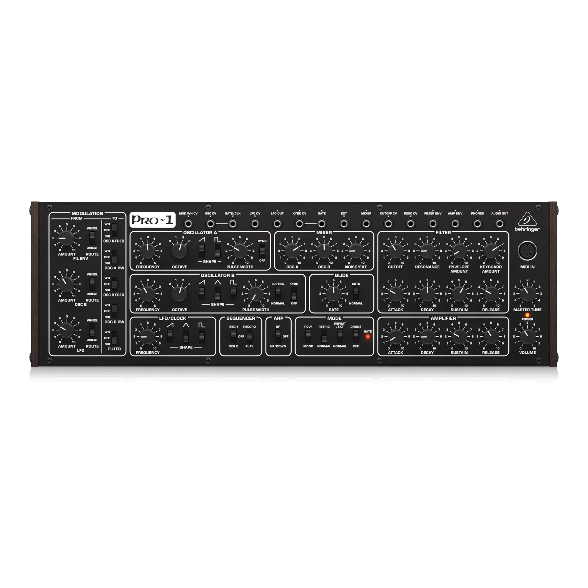 Behringer Pro-1 — доступный ремейк классического монофонического синтезатора Sequential Pro One 1981 года. Схемотехника осталась практически баз изменений, за исключением двух дополнительных CV-разъемов и поддержки USB. Устройство оборудовано двумя осцилляторами на чипах Curtic 3340 с двумя и тремя поддерживаемыми формами волны соответственно. Осцилляторы снабжены регуляторами частоты, ширины импульса и переключателями октав. Второй осциллятор может работать в LFO-режиме. Для обработки сигнала в синтезаторе предусмотрен фильтр с регулировками Cutoff и Resonance, один ADSR-генератор огибающей, один ADSR-генератор в секции усилителя, а многофункциональная матрица модуляции. Микшер позволяет устанавливать соотношение между уровнями первого и второго осцилляторов и регулировать уровень шумовых эффектов. Behringer Pro-1 оборудован встроенным секвенсором с возможностью записи и арпеджиатором. Синтезатор может работать с MIDI-устройствами, для чего предусмотрен вход MIDI IN, расположенный на панели управления и выход THRU на задней панели.