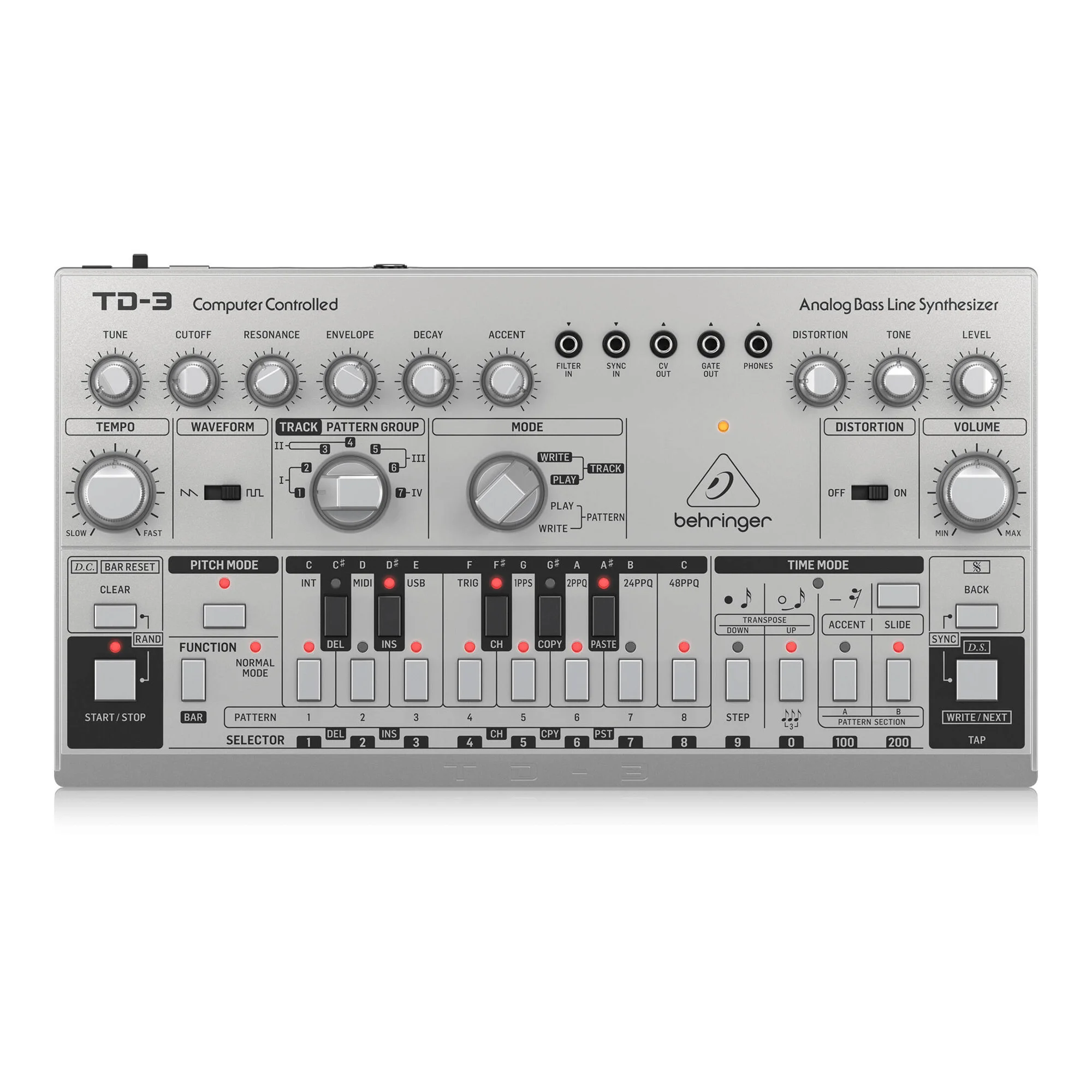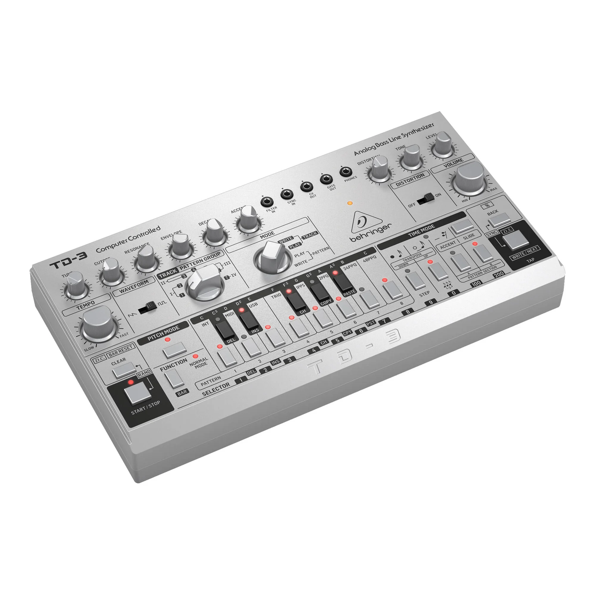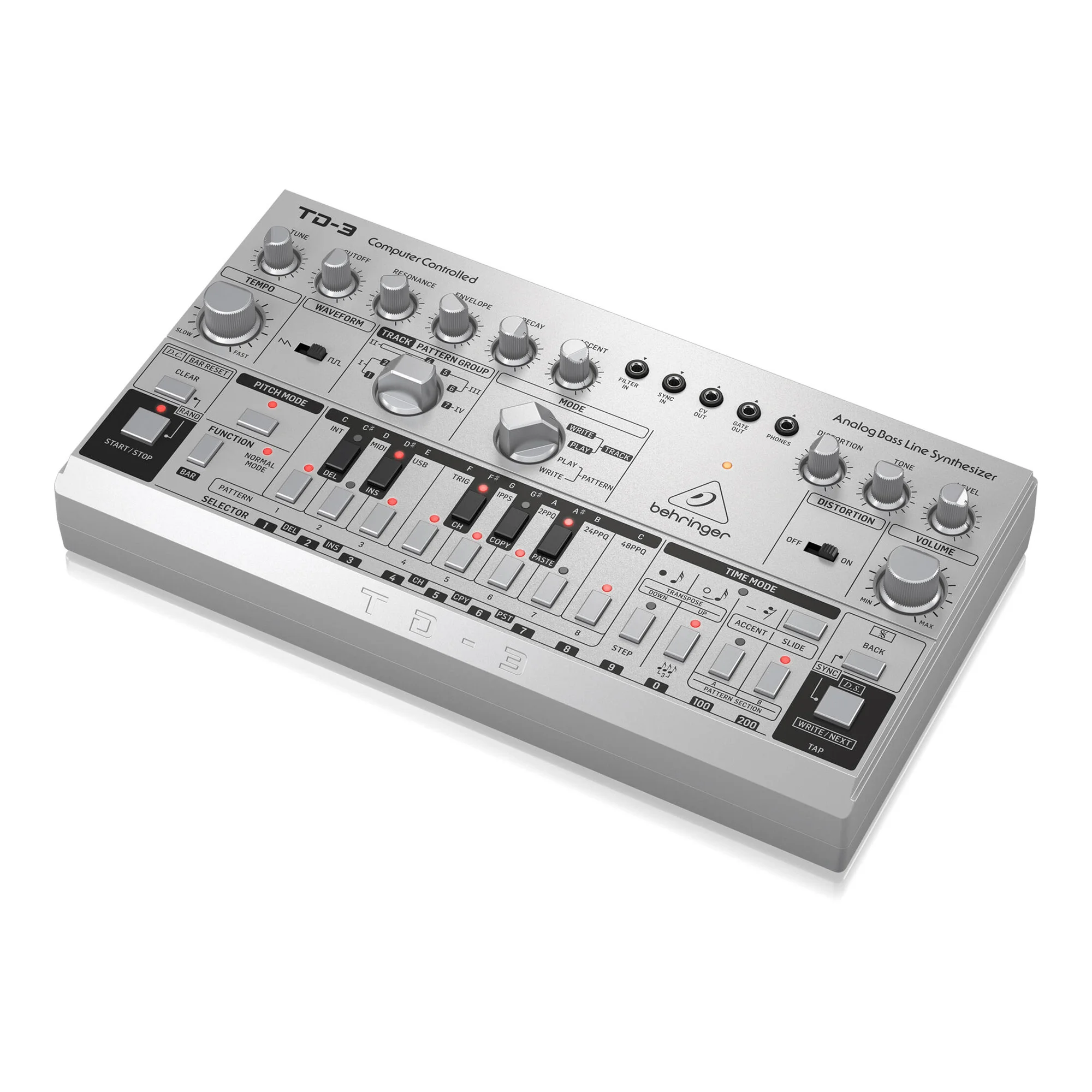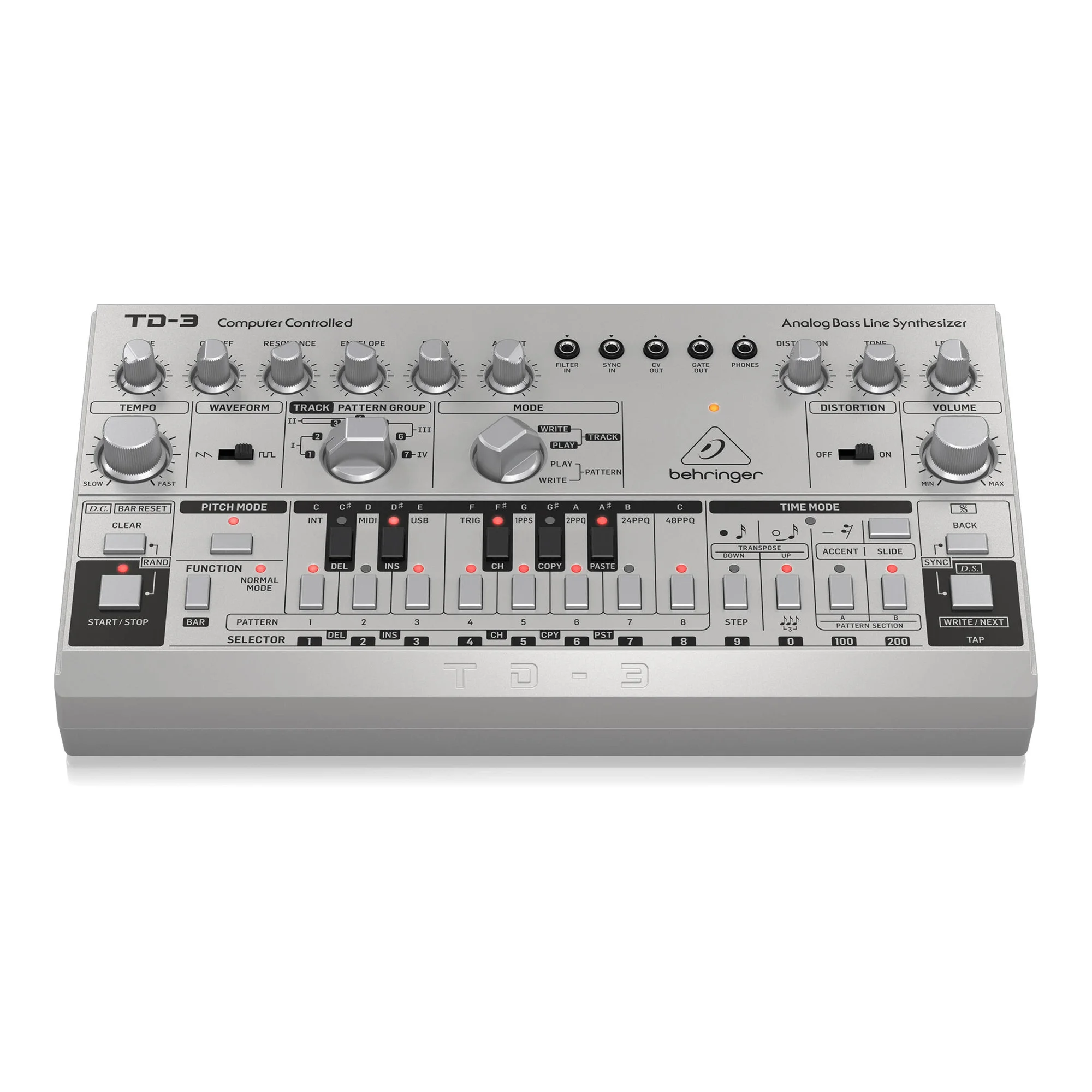 Behringer TD-3 - басовый синтезатор, клон легендарного Roland TB-303. В отличие от именитого предшественника, синтезатор имеет встроенную схему дисторшна, основанную на педали Boss DS-1, и поддержку MIDI/USB. Синтезатор полностью воссоздает схему VCO, VCF и VCA оригинального устройства и оснащен 16-ступенчатым секвенсором. Доступно 2 формы звуковой волны осцилятора: пила и прямоугольник, а также низкочастотный фильтр, регулирующий cut-off, резонанс, время затухания и атаку.