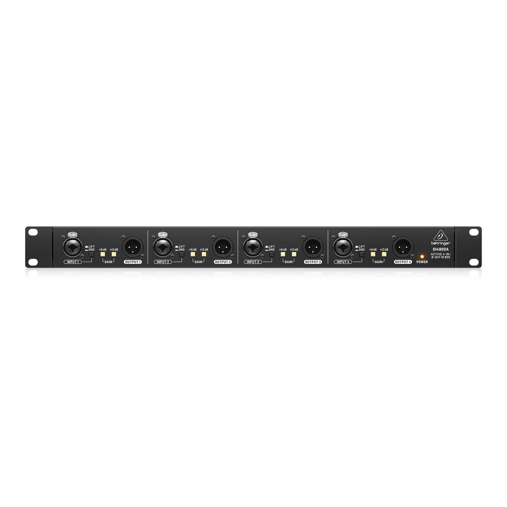 На передней панели каждый канал имеет свой собственный сбалансированный XLR-выход для подключения отдельных сигналов к основному микшерному пульту. На задней панели каждый канал оснащен дополнительным сбалансированным XLR-выходом для разделения и отправки сигнала на альтернативное устройство. Благодаря переключаемым усилителям на +6 и +12 дБ, DI4800A легко справляется с сигналами низкого уровня от таких инструментов, как акустические гитары. Кроме того, накладки на уровне -20 дБ обеспечивают защиту от неожиданных скачков сигнала.