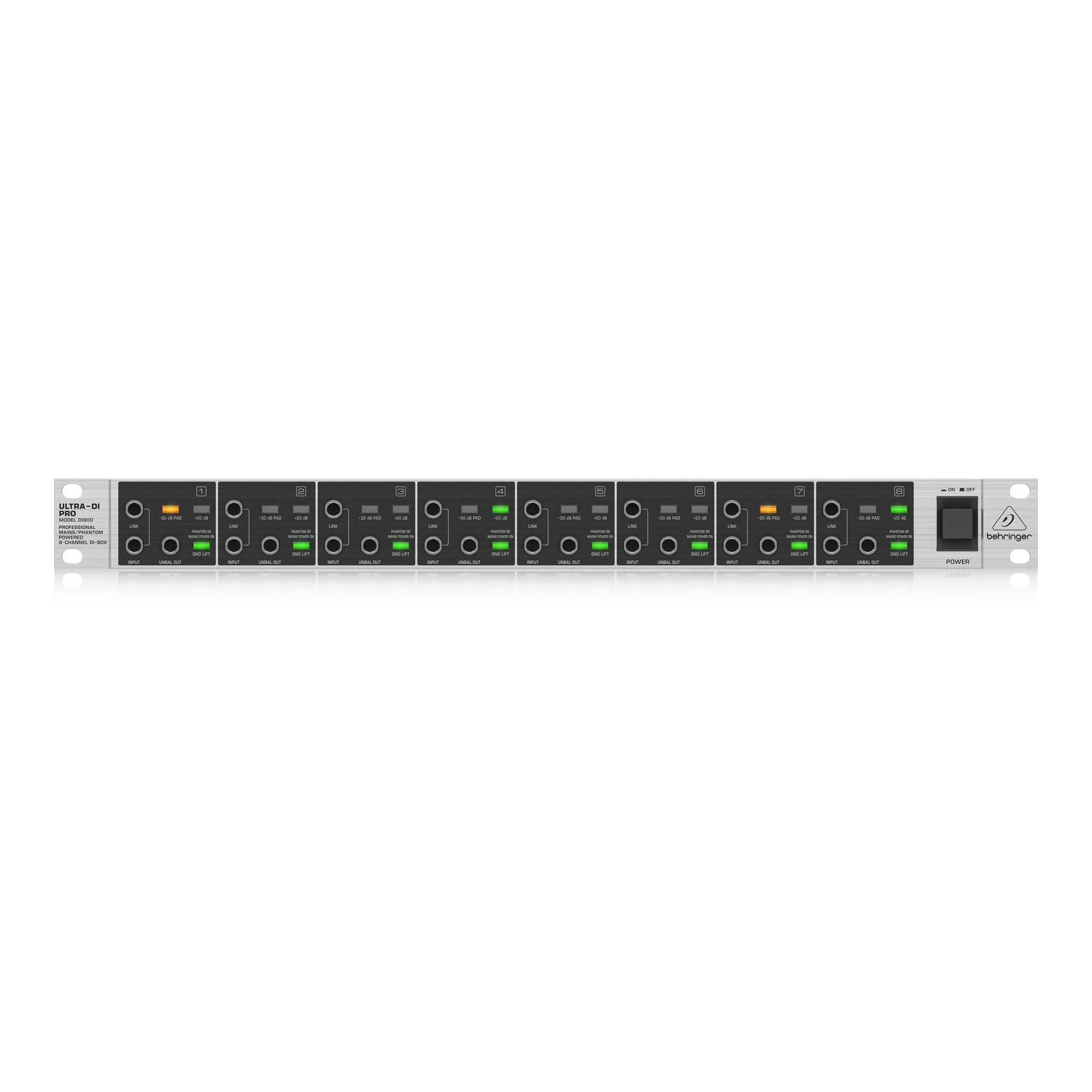 BEHRINGER DI 800 V2- это 8-канальный активный директ бокс с универсальным питанием (сеть или фантом). Таким образом, можно подключить его к обычной розетке (120 - 240В), либо же использовать фантомное питание от микшерного пульта (постоянный ток от +18В до +48В).