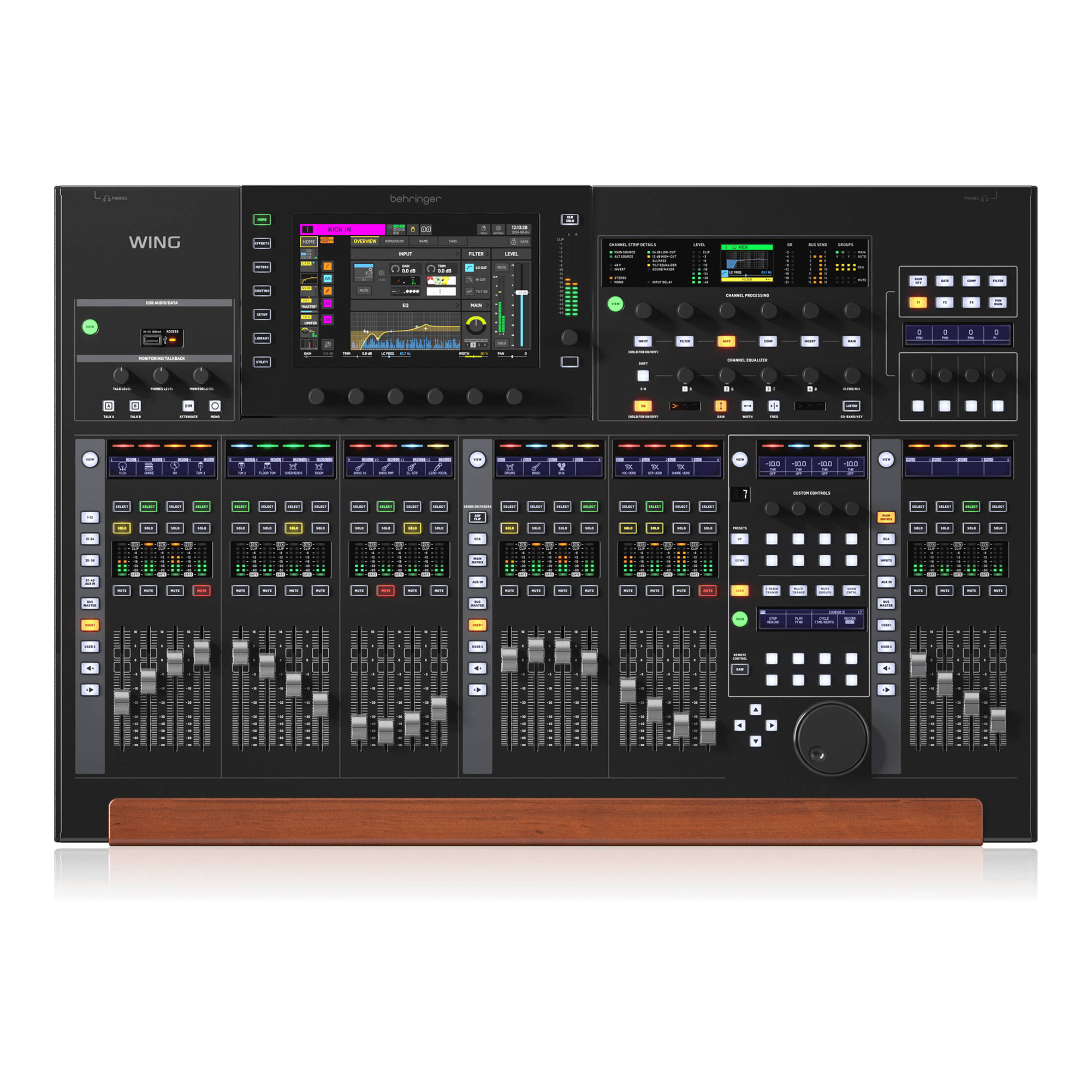 Для управления консолью и каналами предусмотрены 24 моторизованных фейдера (100 мм), большой сенсорный дисплей. Дополнительно на микшере установлены сенсорные элементы управления, выполняющие роли вращающихся регуляторов. На корпусе Behringer WING также располагается два порта для подключения SD-карт — консоль может работать как полевой рекордер с возможностью одновременной записи до 64 дорожек и расстановкой маркеров на треке.