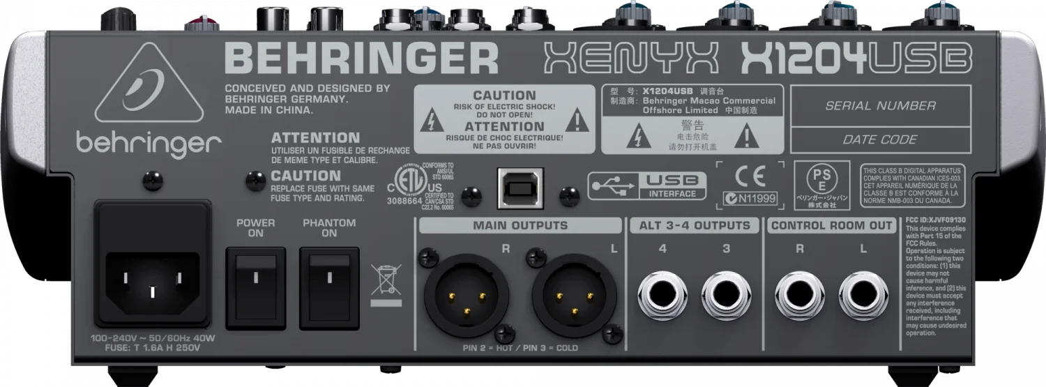 XENYX X1204USB имеет 8 основных канальных входов: 4 монофонических и 2 пары стереофонических. Кроме этого предусмотрено 2 стереоканала для ALT 3-4 шины. 4 микрофонных входа совместимы с динамическими и конденсаторными микрофонами, поскольку микшер имеет функцию отключаемого фантомного питания. Во избежание появления паразитарных шумов микрофонная секция оснащена фильтрами низких частот, а для предварительной нормализации звука вокала или инструмента имеются фирменные предусилители Behringer.