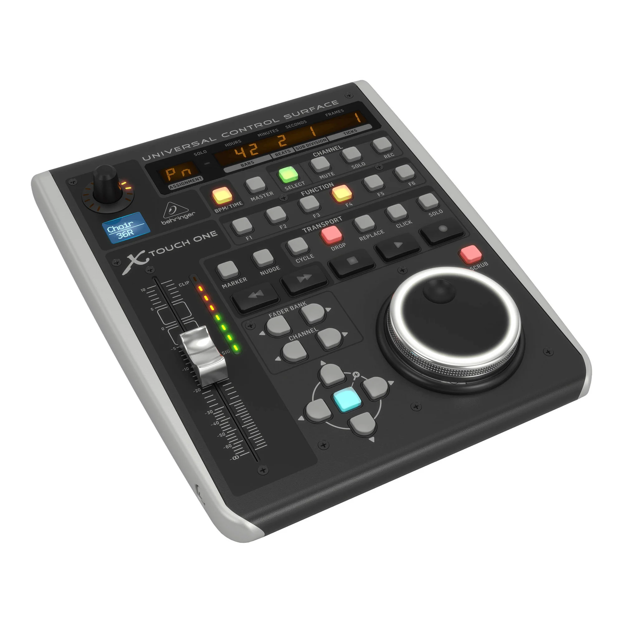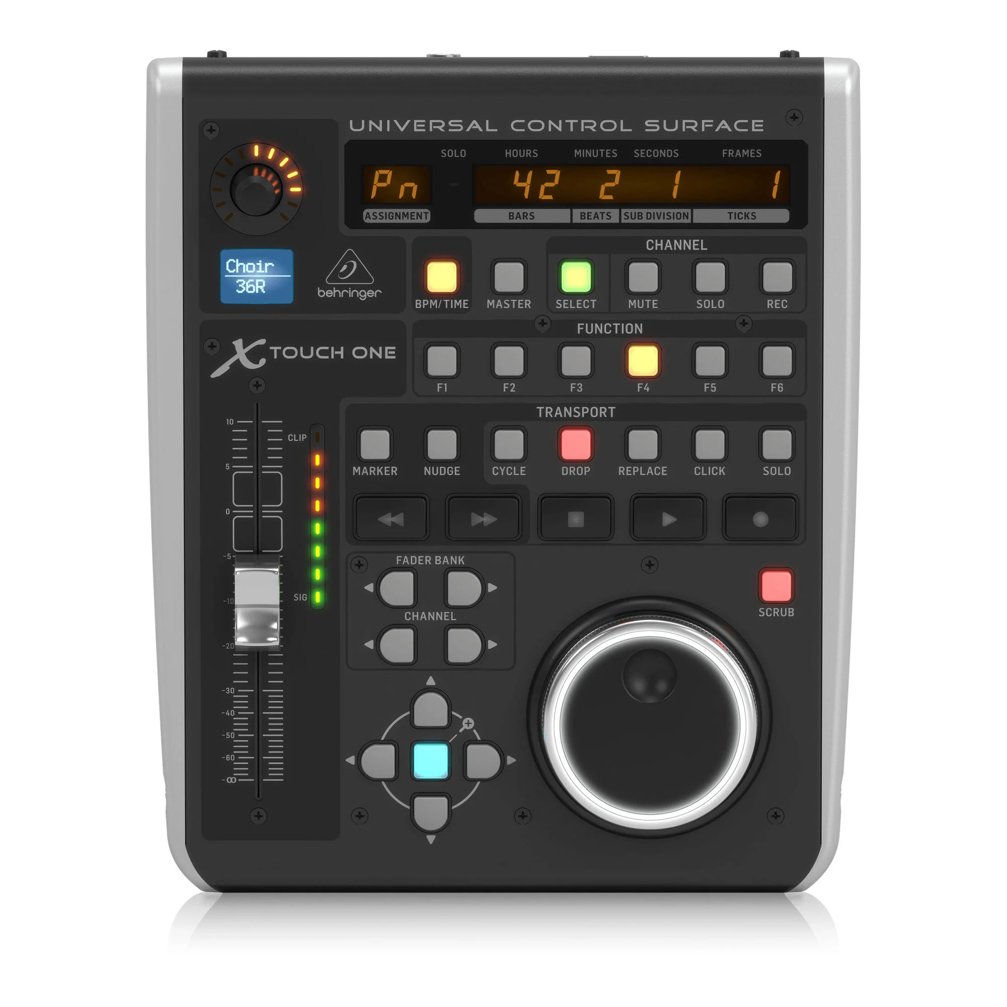 Навигация - это бриз с богатыми функциями поверхности X-TOUCH ONE. Большое колесо jog/shuttle и управление транспортированием ленточного стиля обеспечивают интуитивный контроль над наиболее часто используемыми функциями в вашей DAW, будь то "гонка" между банками фейдера с одним нажатием кнопки или внесением изменений путем поворота регулятора control.