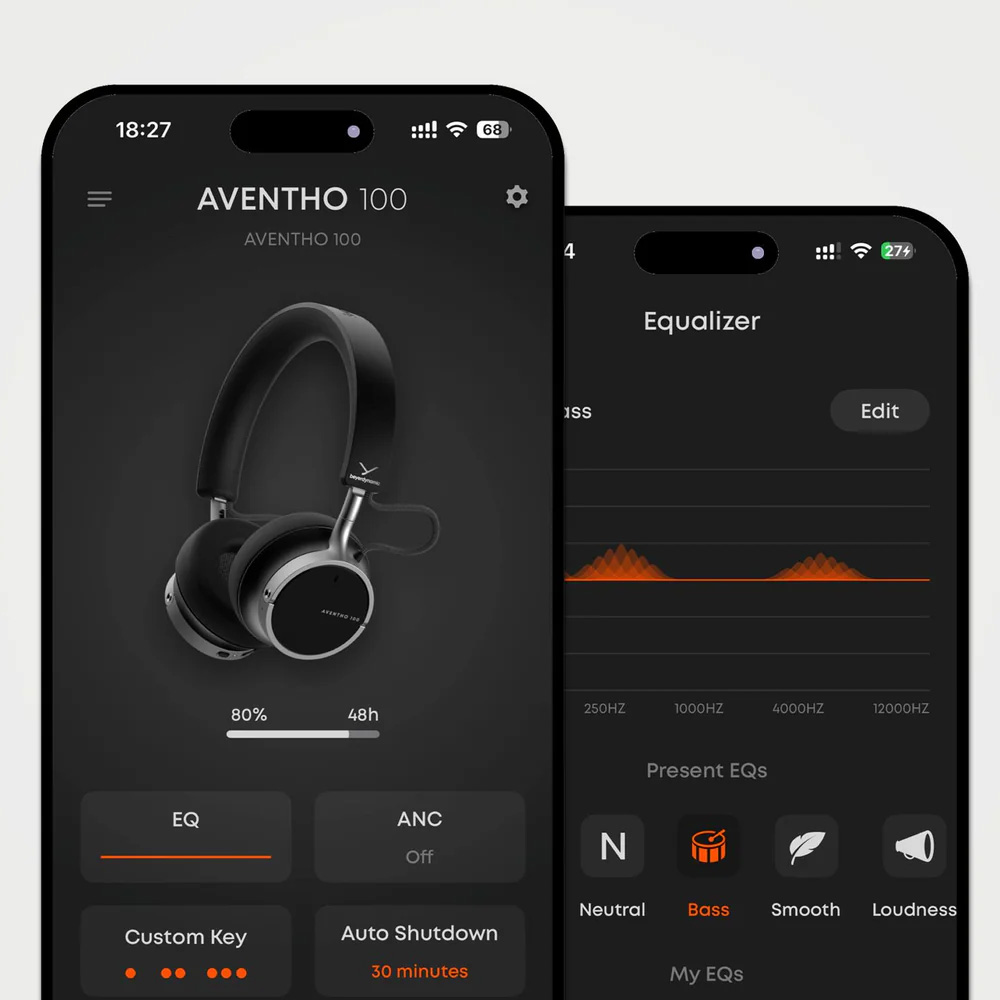 Используйте приложение beyerdynamic, чтобы настроить AVENTHO 100 в соответствии с вашими потребностями. Настройте функцию активного шумоподавления (ANC) в соответствии с вашими предпочтениями, получайте обновления встроенного по и всегда будьте в курсе событий – и все это с помощью вашего смартфона.