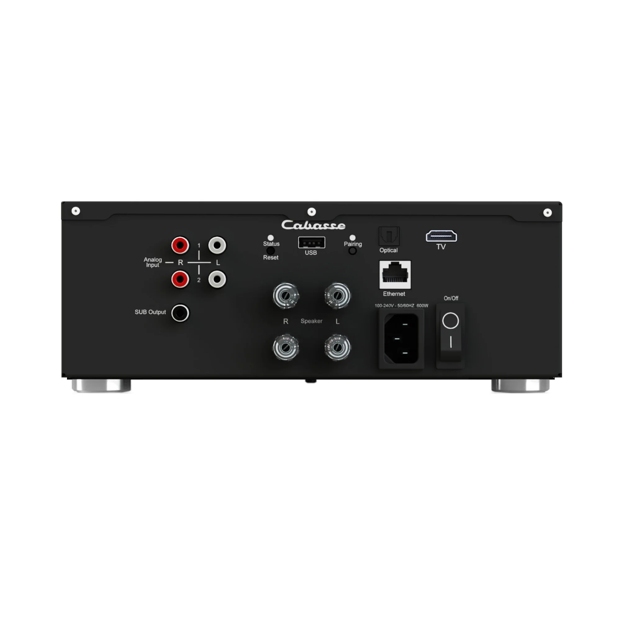 В дополнение к многочисленным опциям потоковой передачи, усилитель Cabasse Abyss предлагает хорошо оснащенное подключение, например, с двумя входами RCA и оптическим входом для подключения проигрывателя винила с предварительным усилением или проигрывателя компакт-дисков. Удобный порт HDMI eARC также подходит для подключения телевизора. Наконец, выход на сабвуфер позволяет подключить к нему сабвуфер.