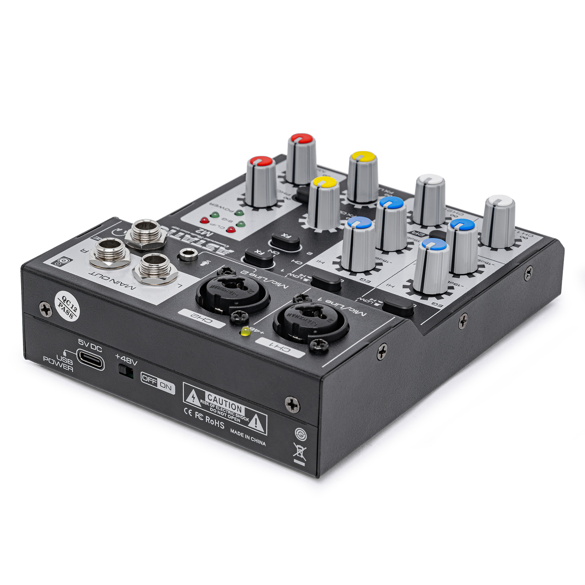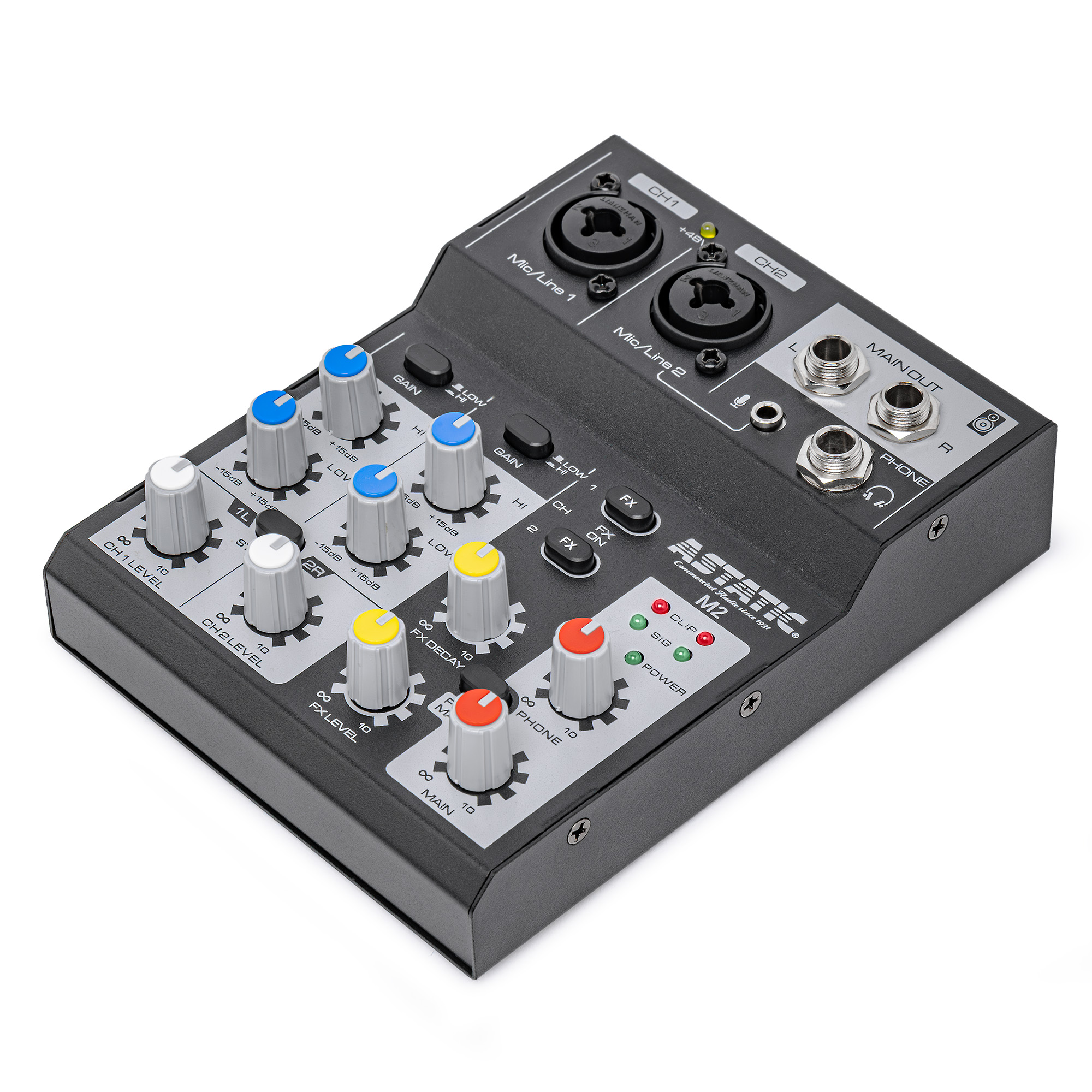 M2 имеет два комбинированных XLR/1/4" входа, два балансных 1/4" TRS основных выхода, один 1/4" выход для наушников и 3,5-мм микрофонный вход для гарнитуры, который направляется на второй канал для микширования. Выбираемое фантомное питание +48 В позволяет использовать любой конденсаторный микрофон или питать микшерную лампу. Каждый канал имеет выбираемые вставки реверберации FX с выделенными регуляторами уровня и глубины, регуляторами громкости и 2-полосным полочным эквалайзером для быстрого создания идеального микса.