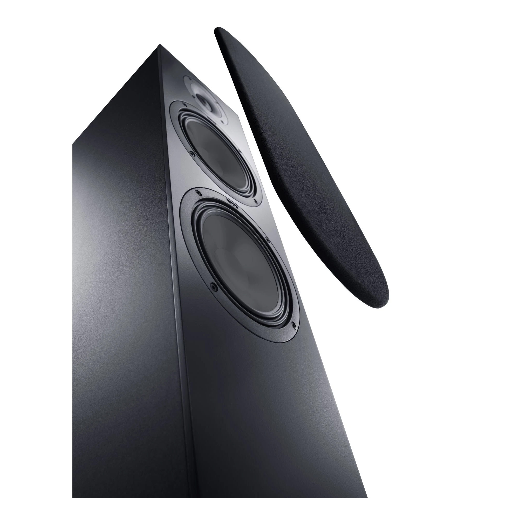 При высоте всего 95 см и ширине 19 см модель GLE 70 S2 легко впишется в интерьер любого помещения. Она доступна в белом, черном или макассаровом исполнении с матовой отделкой и тканевыми решетками на магнитах. Четыре встроенные ножки обеспечивают устойчивость и оптимальную акустическую развязку.