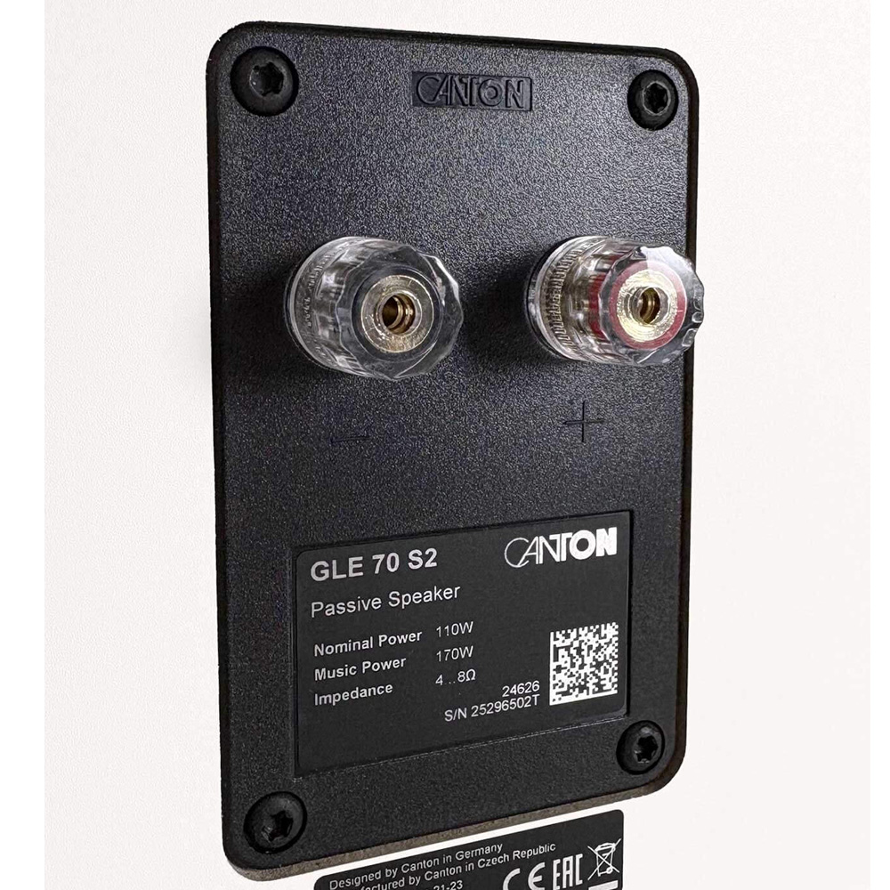 При высоте всего 95 см и ширине 19 см модель GLE 70 S2 легко впишется в интерьер любого помещения. Она доступна в белом, черном или макассаровом исполнении с матовой отделкой и тканевыми решетками на магнитах. Четыре встроенные ножки обеспечивают устойчивость и оптимальную акустическую развязку.