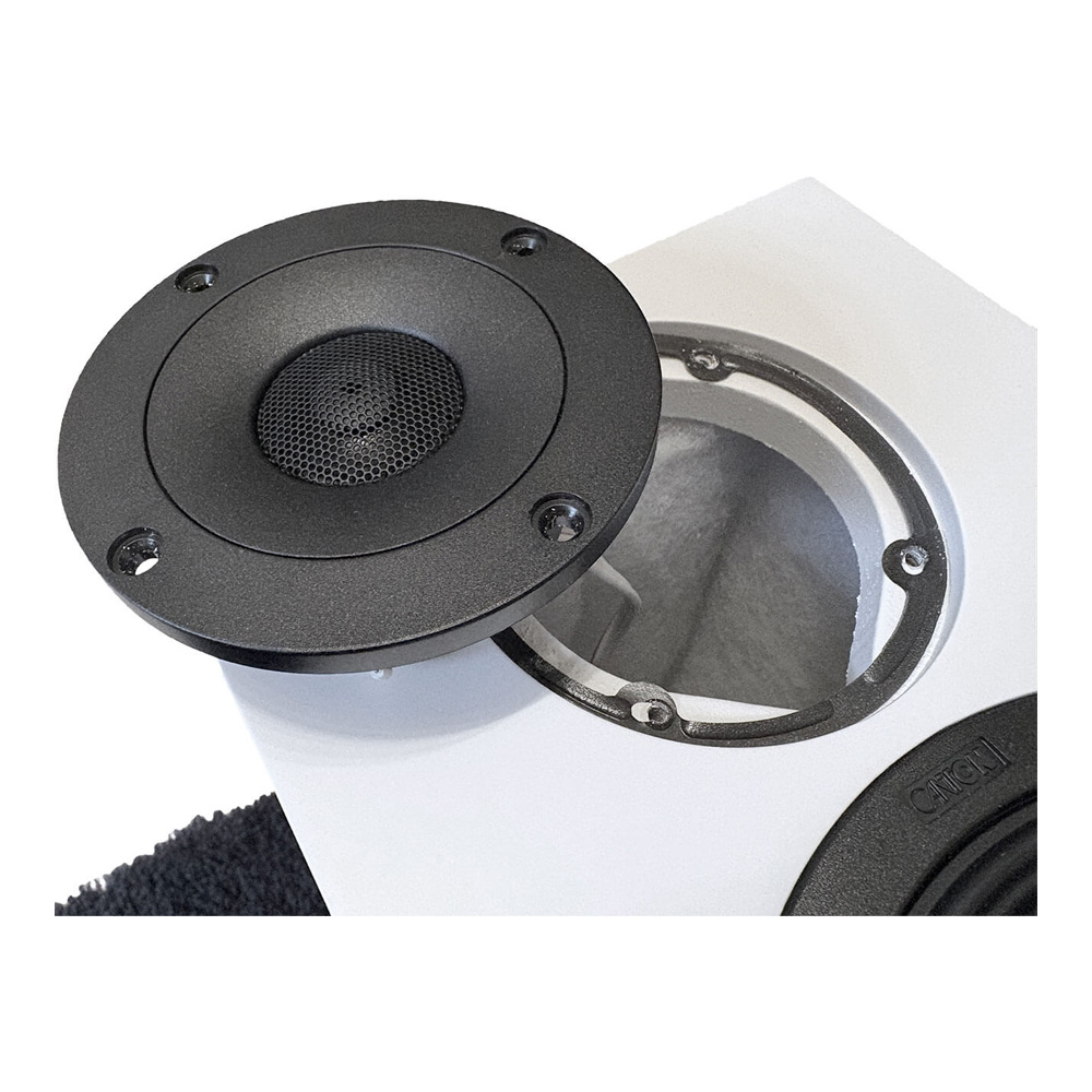 25-миллиметровый AB-твитер (черный алюминий) со встроенным волноводом обеспечивает четкие, детализированные высокие частоты частотой до 40 000 Гц. Широкая диаграмма направленности обеспечивает открытость и прозрачность звуковой сцены даже при прослушивании вне оси.
