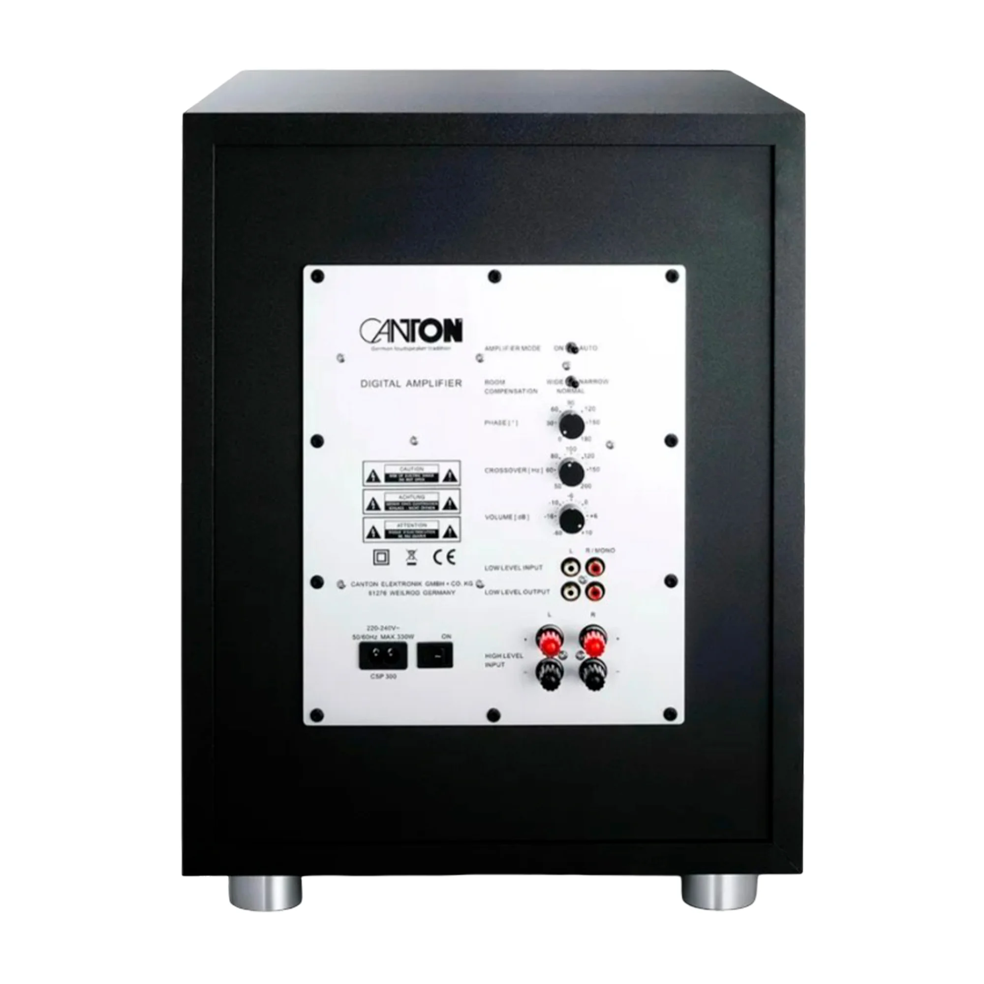 Сетевой кабель снимается, режим работы отображает светодиодный индикатор на фасадной части корпуса. Canton Power Sub 8 оборудован разъёмами низкого и высокого уровня, что открывает широкие возможности для подсоединения к различным устройствам, например, предусилителю, активным колонкам и даже другому сабвуферу для создания мощной звуковой системы.
