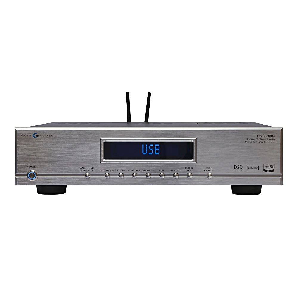 Модель Cary Audio Design DAC-200ts может работать как предусилитель, так как оснащена выходом с регулируемым напряжением (до 3 В). На борту имеется Bluetooth-модуль CSR Bluetooth (v4.0), повышающий качество звучания с помощью кодека aptX. Есть поддержка Wi-Fi и Ethernet-интерфейса для подключения к локальной сети и управления устройством по сети или через приложение, установленное на устройства с iOS и Android. В комплект входит пульт ДУ.