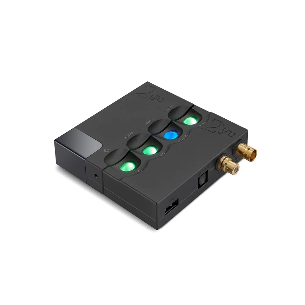 Chord 2Yu - это усовершенствованный цифровой интерфейс, разработанный для 2go, с помощью которого пользователь отходит от обязательного совместного использования ЦАПа Chord Hugo 2, получая готовый портативный стример/сетевой плеер с цифровыми выходами. Корпус 2Yu сделан из авиационного сплава, полусферические подсвечиваемые органы управления отвечают за выбор активного выхода, включение/выключение, заглушение звука mute и яркость подсветки.